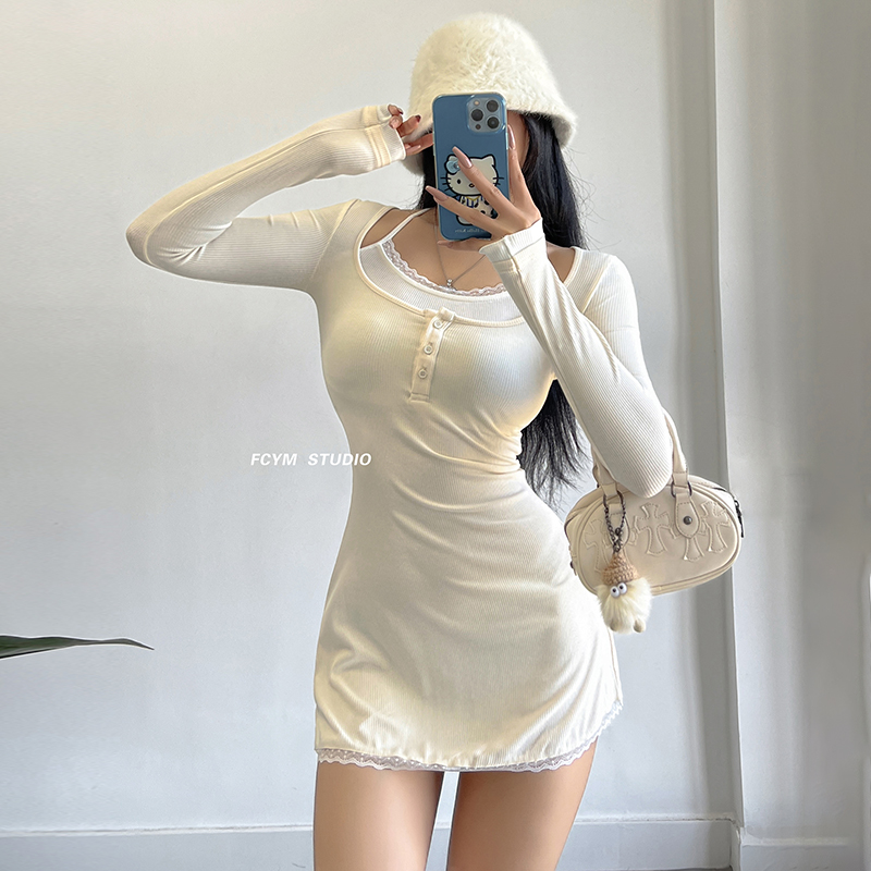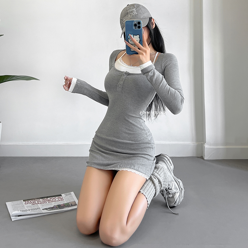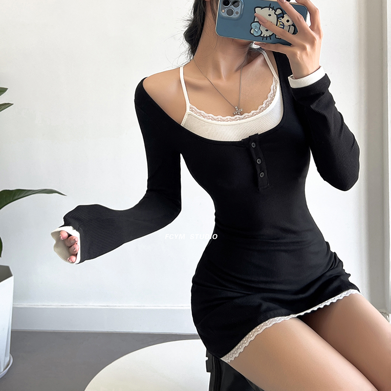 风车与矛 纯欲风性感辣妹挂脖长袖连衣裙女秋冬收腰显瘦包臀短裙