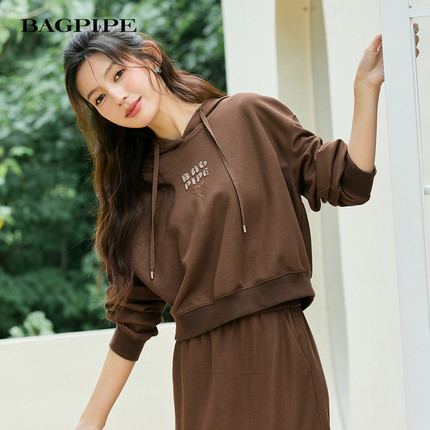 风笛2025春季新款休闲抽绳连帽字母刺绣短款卫衣女设计感上衣