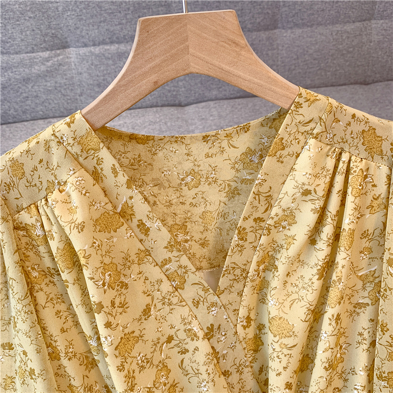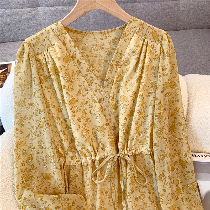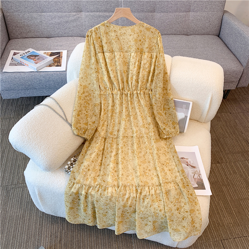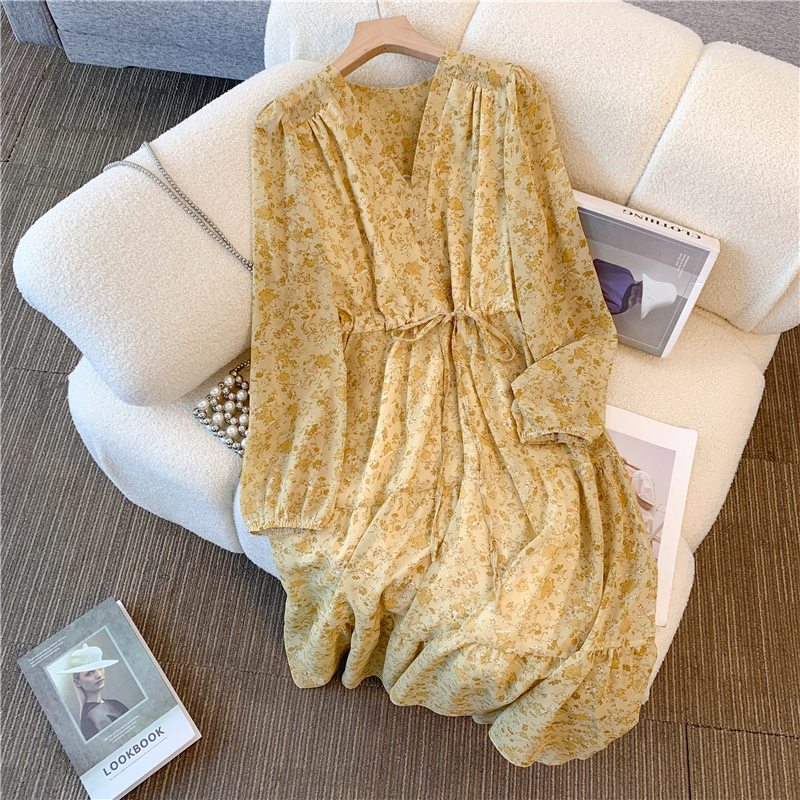 春秋大码女装胖mm宽松显瘦200斤高腰抽绳碎花中长款V领长袖连衣裙