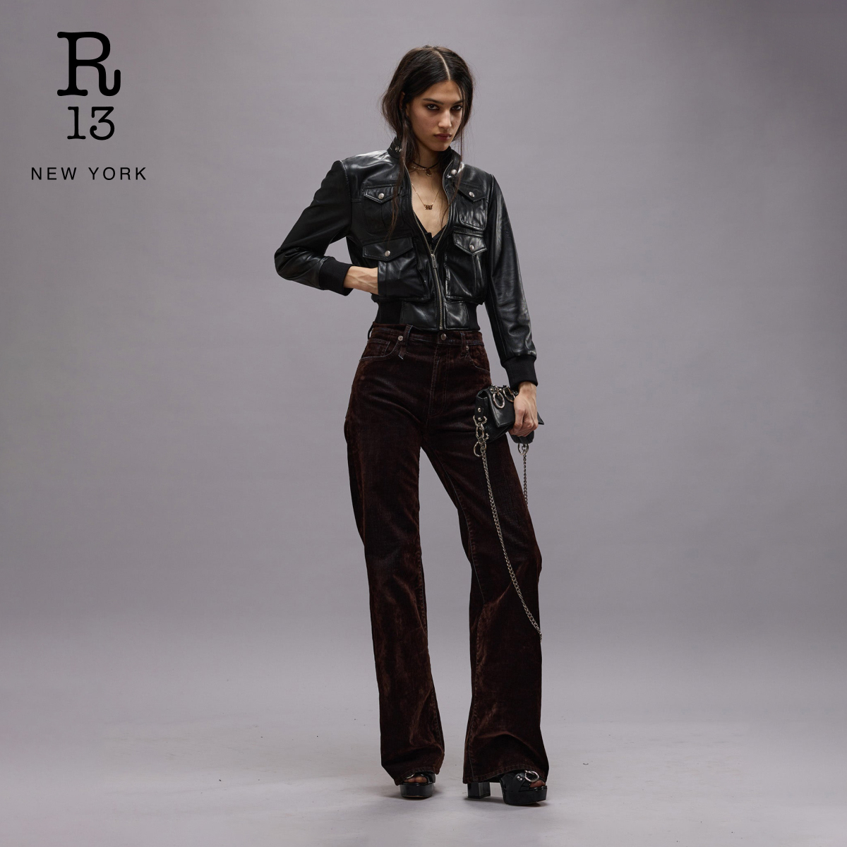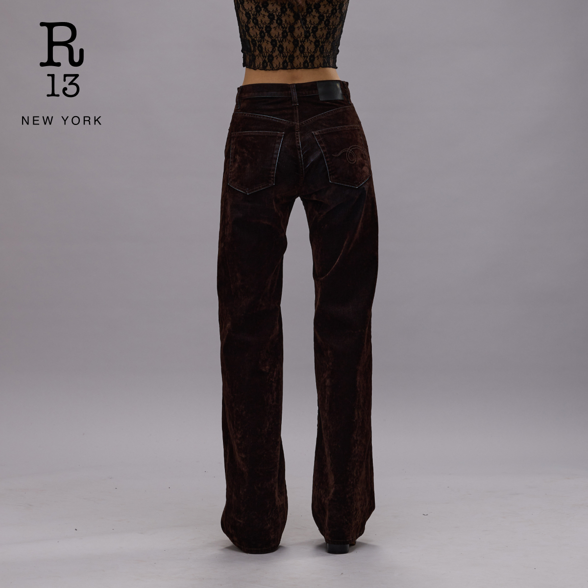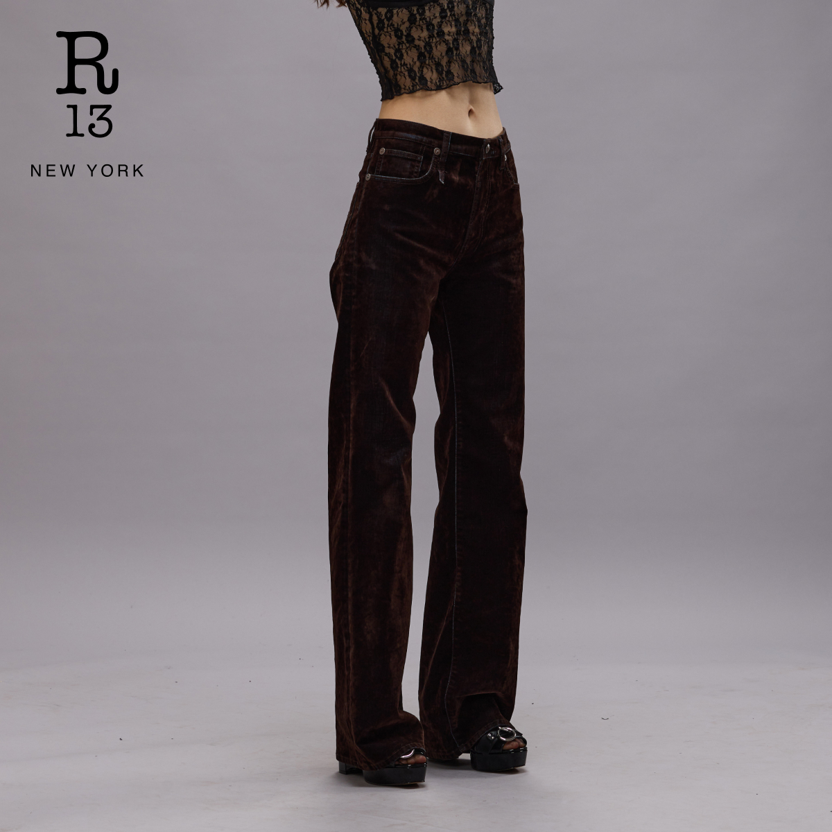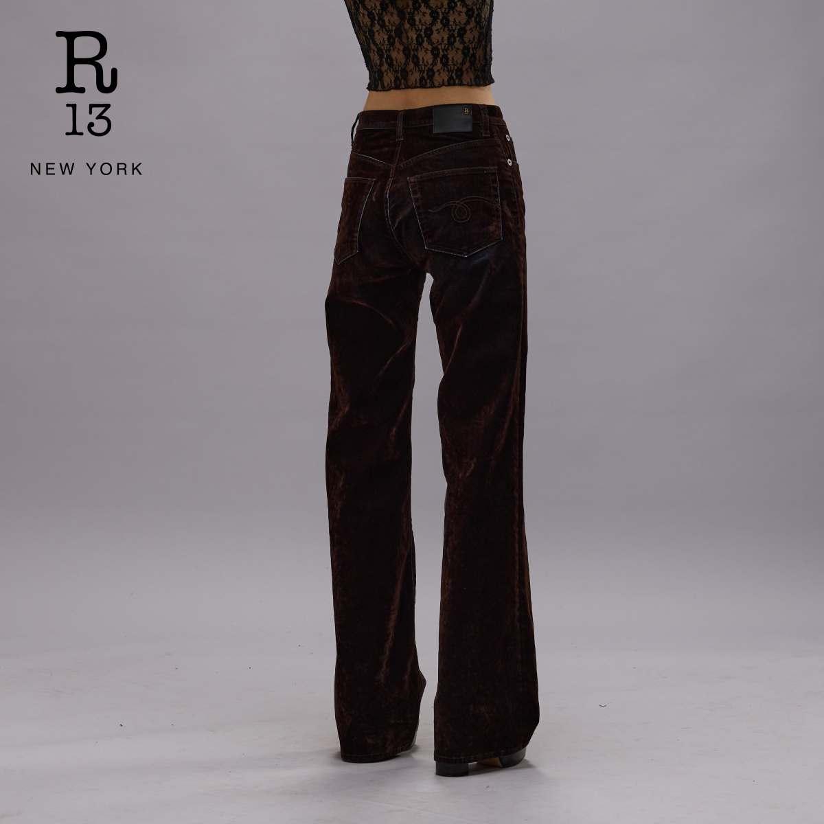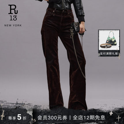 R13秋冬丝绒质感高腰微喇牛仔裤