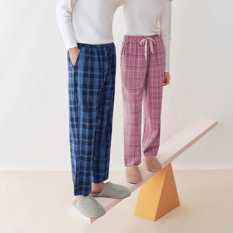三枪纯棉抗静电情侣格子睡裤