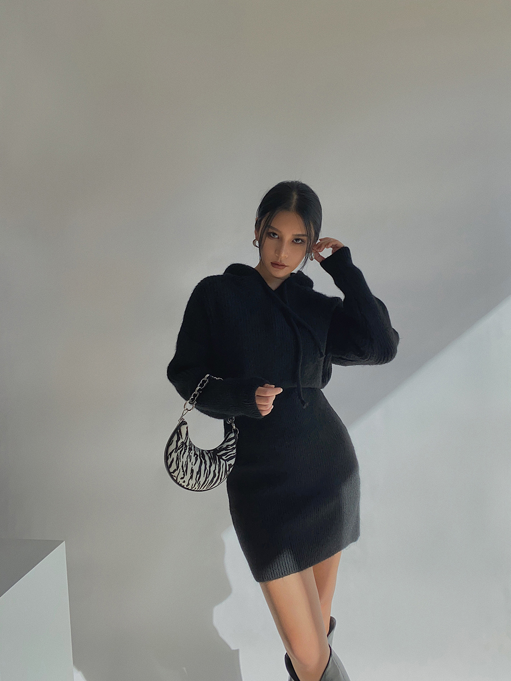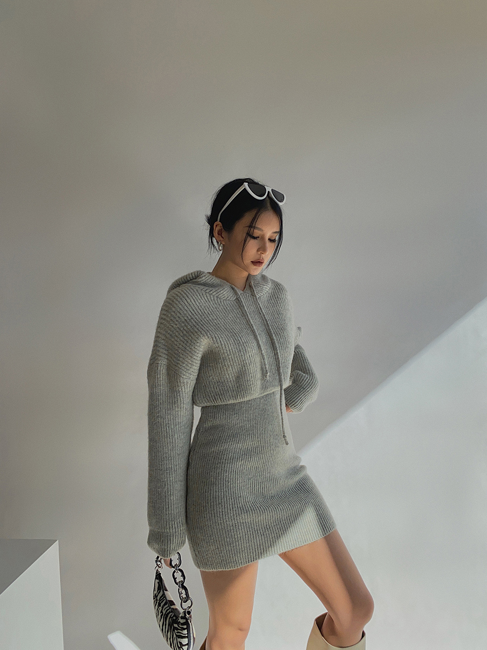 自制戴帽针织卫衣包身高腰短裙