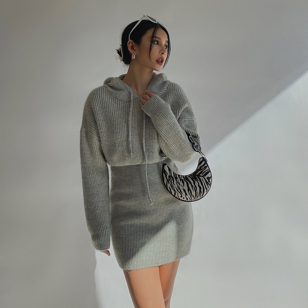 自制戴帽毛衣针织卫衣长袖性感包身短裙显瘦高腰连帽连衣裙显身材