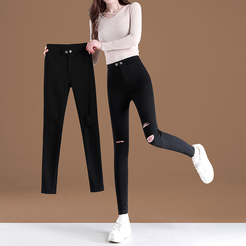 黑色破洞打底裤女外穿春秋季2024新款高腰夏薄款九分小脚裤小黑裤