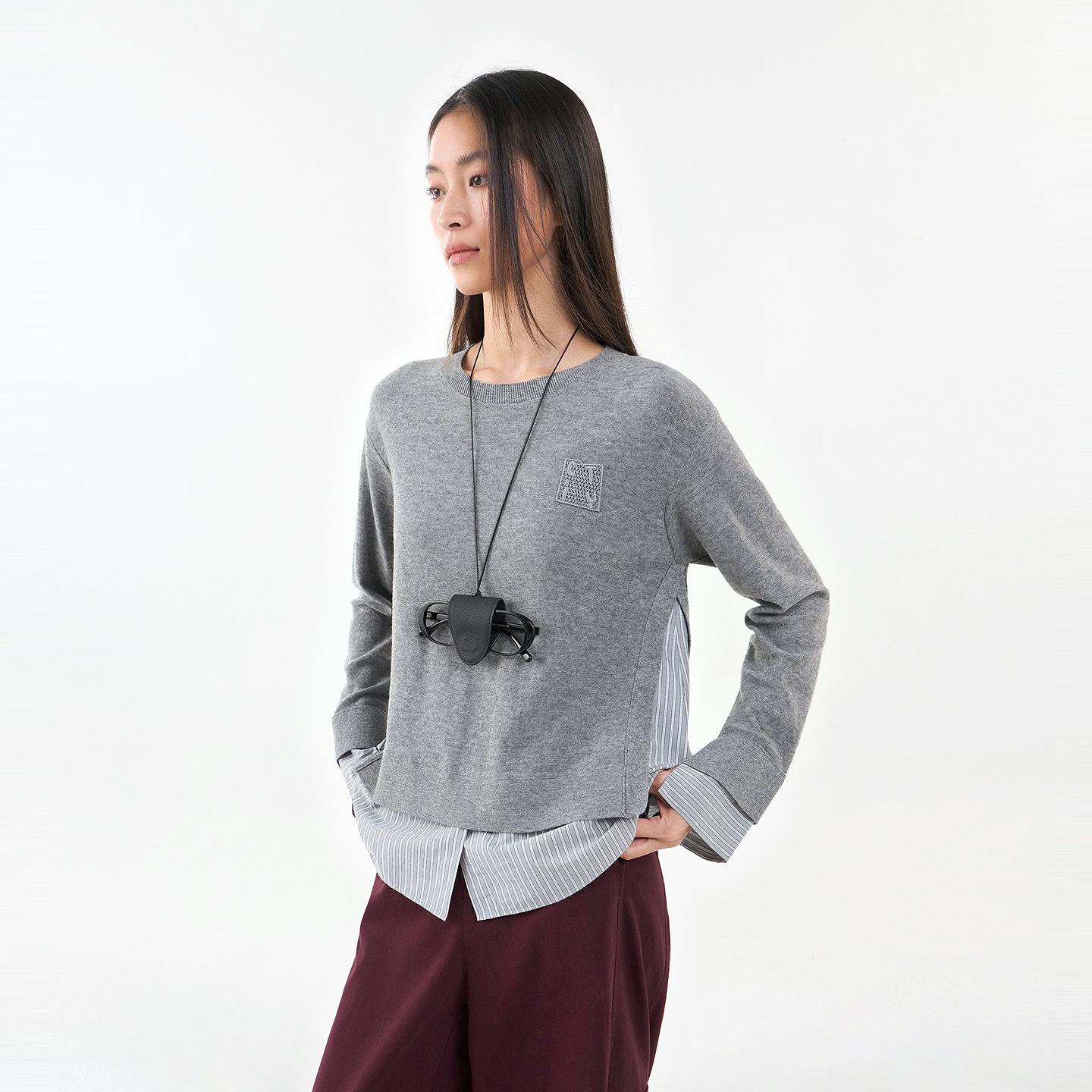 [专柜同款]Yifini/易菲拼接假两件圆领长袖针织衫条纹宽松毛衫女