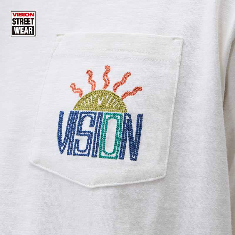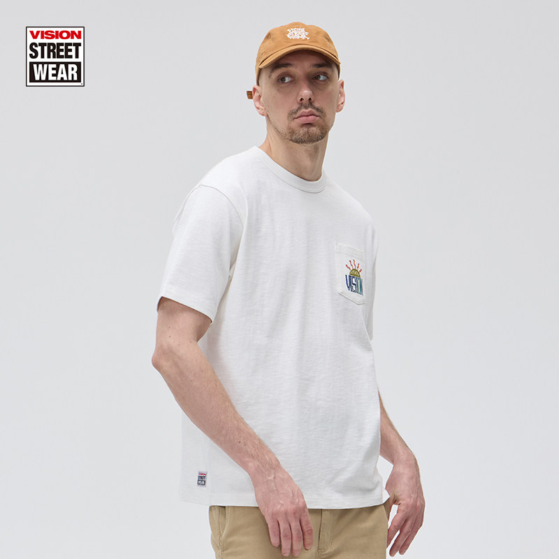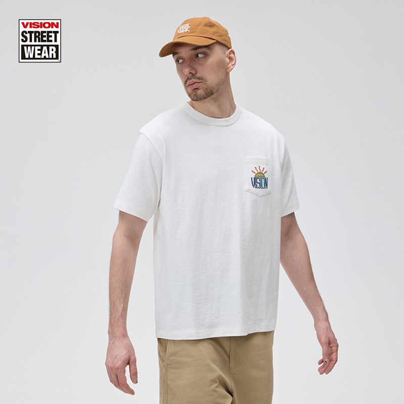 VISION官方 美式街头复古竹节棉宽松圆领口袋短袖T恤2色男女同款