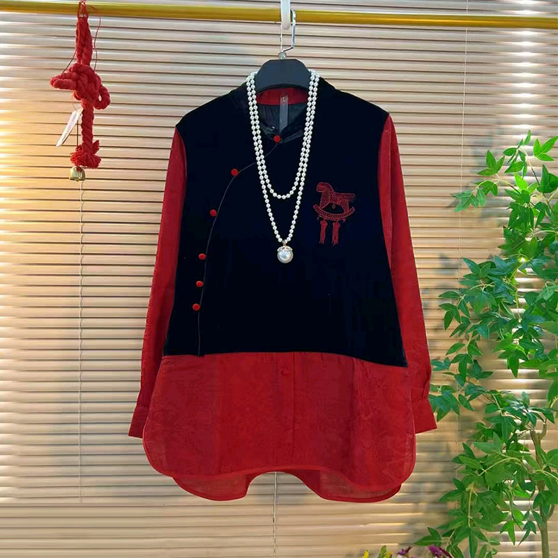 大码女装拼色长袖斜襟上衣