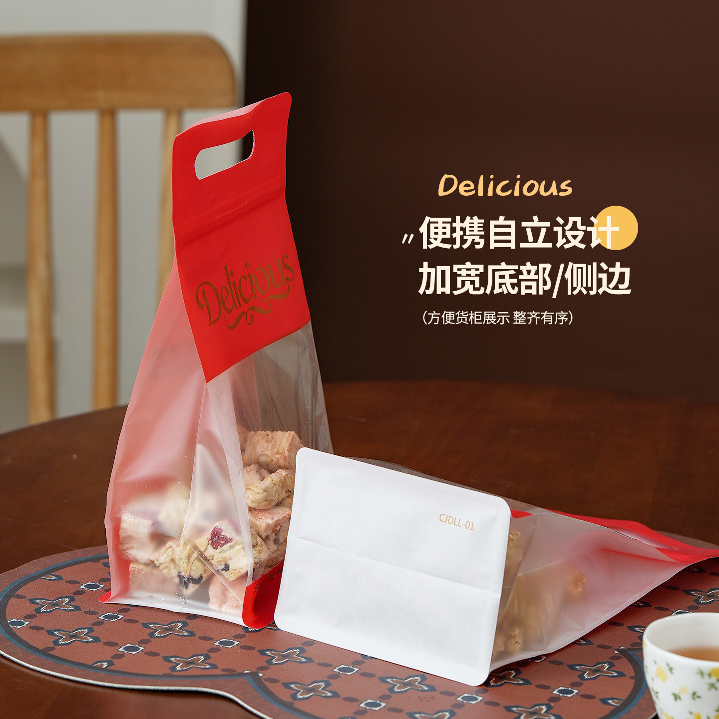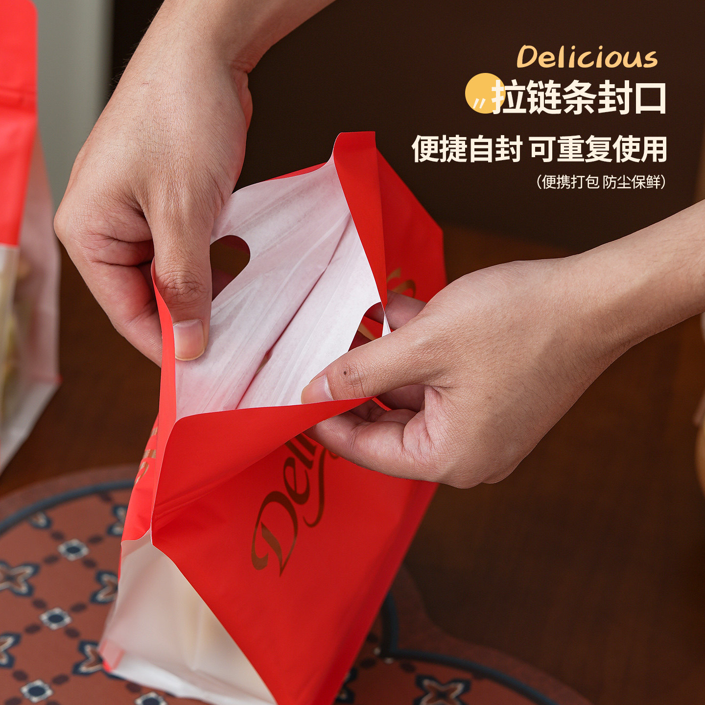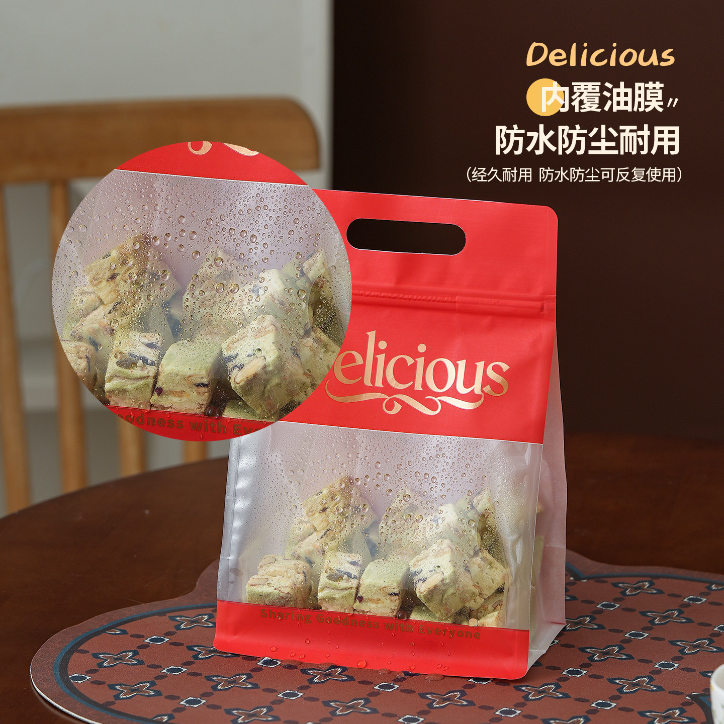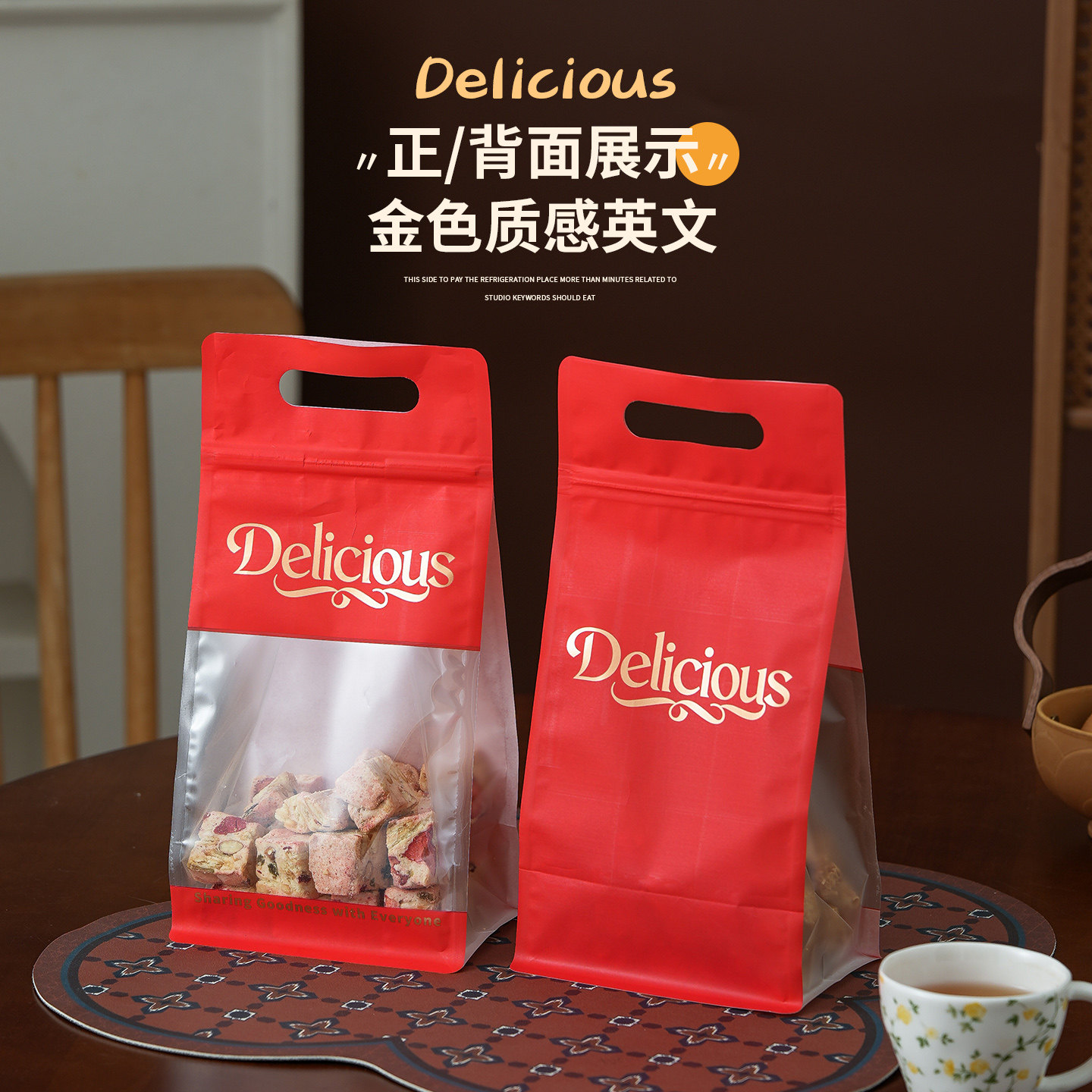 年货礼品包装雪花酥牛轧糖糯米船曲奇饼干拉链红色八边封手提袋