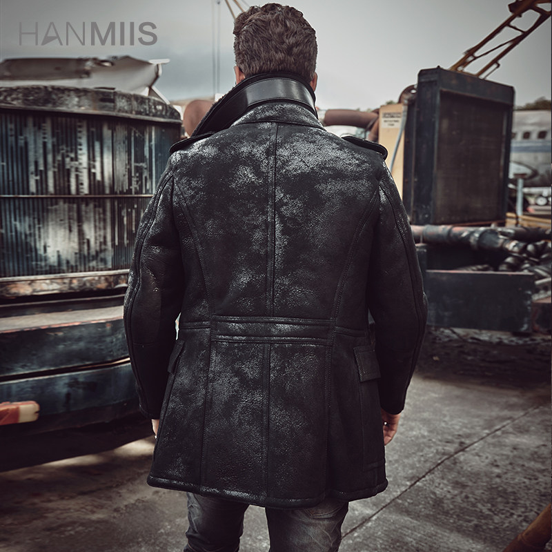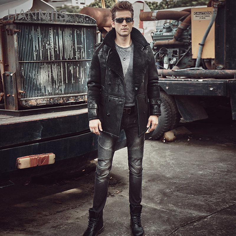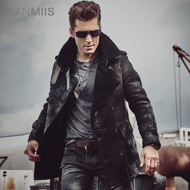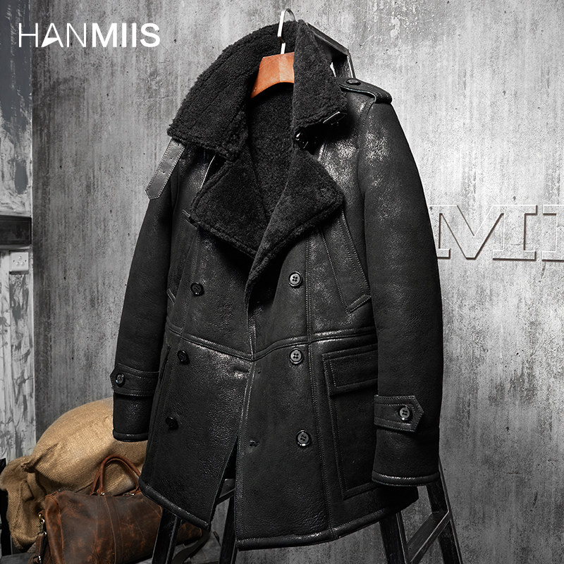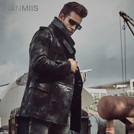 HANMIIS猎装皮毛一体男中长款空军飞行服皮夹克男装皮草真皮外套