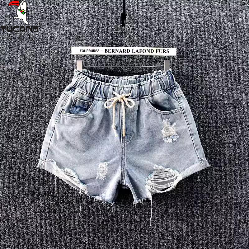 啄木鸟松紧腰牛仔短裤女宽松破洞阔腿裤大码胖mm显瘦2025夏季新款