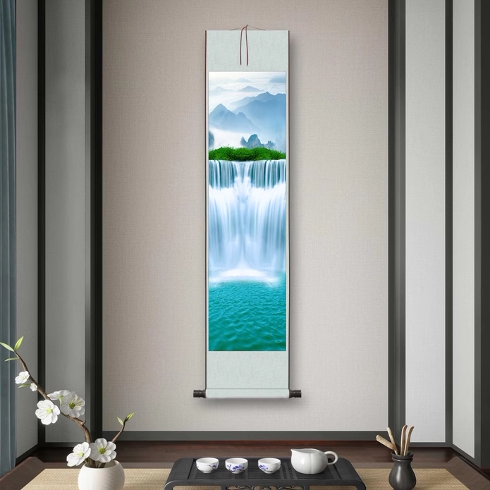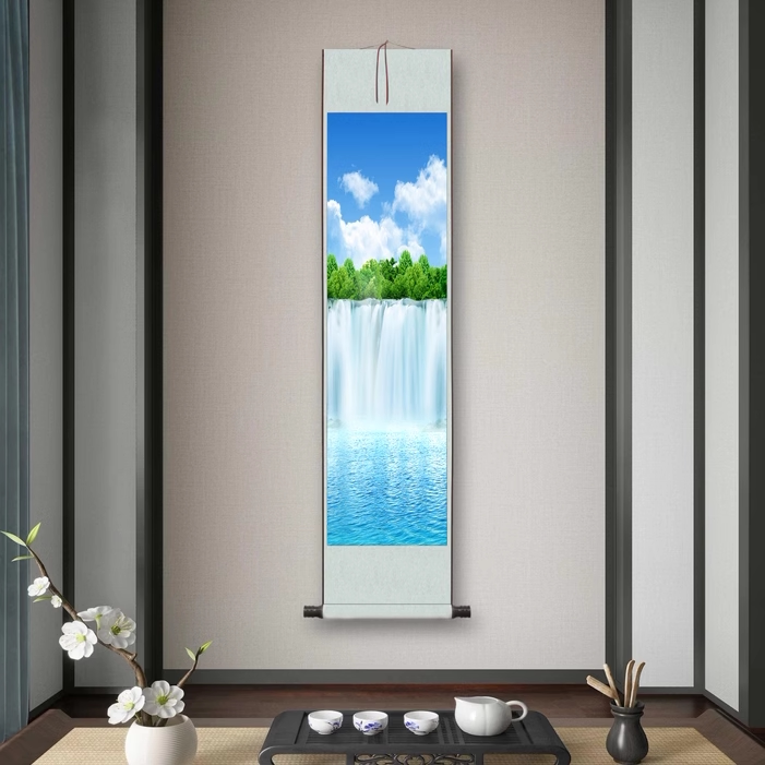 长轴流水瀑布山水画实木卷轴挂画沙发背景墙书房玄关中式风水挂画
