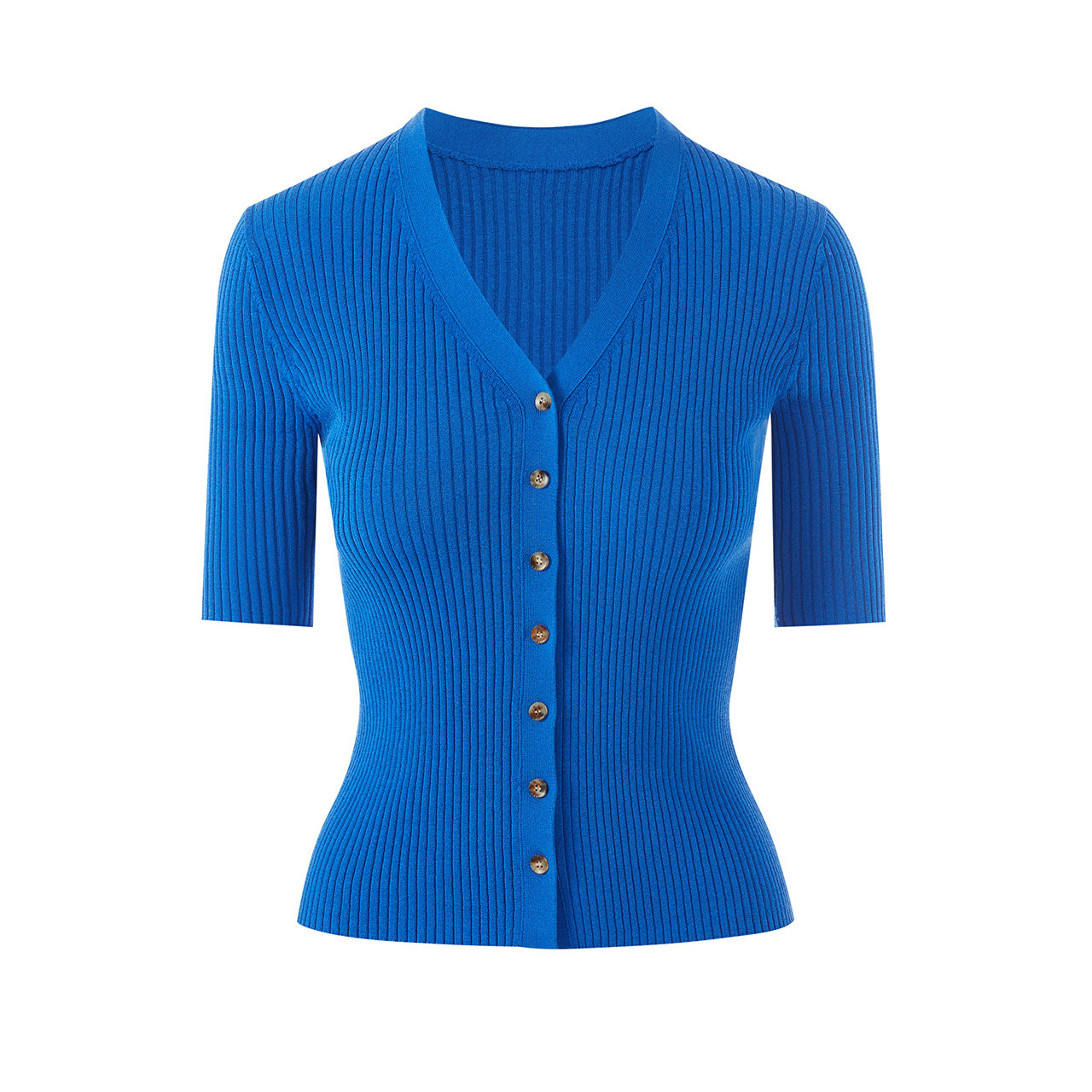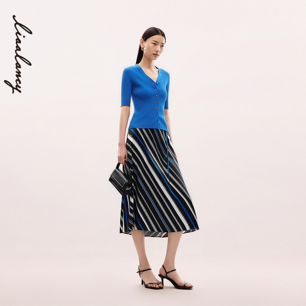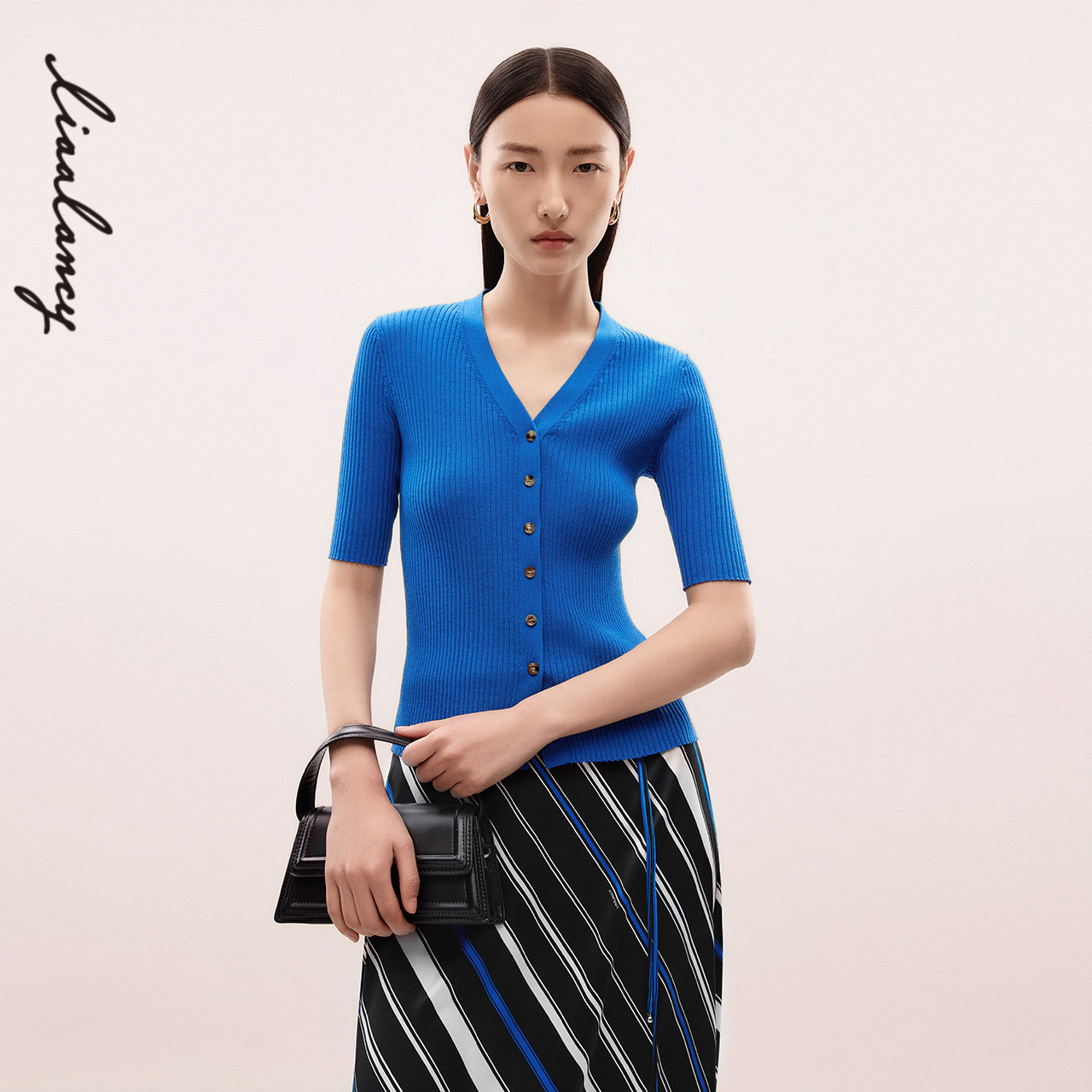 LANCY/朗姿2025年夏新款气质时尚修身V领短袖针织开衫女蓝色上衣