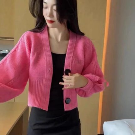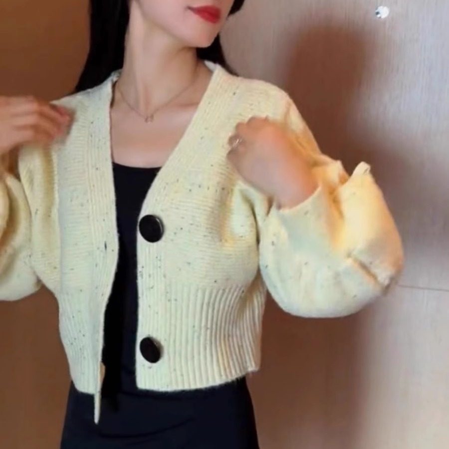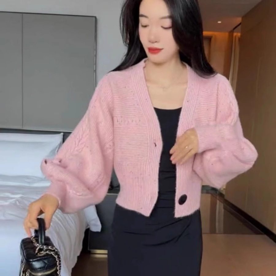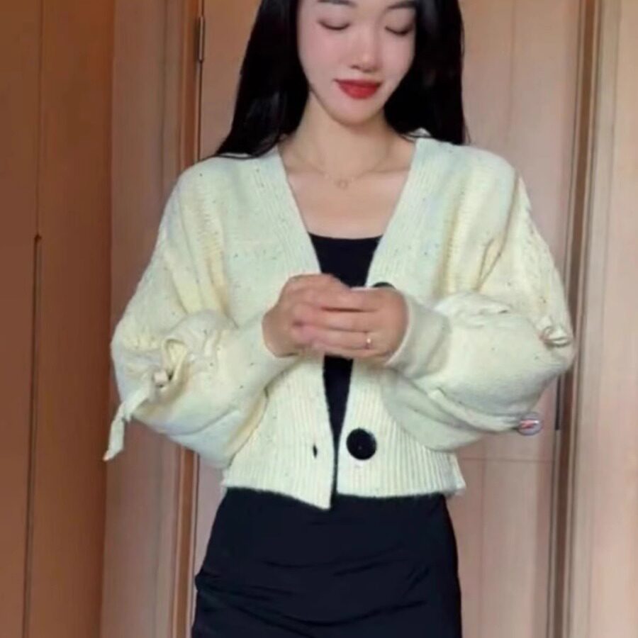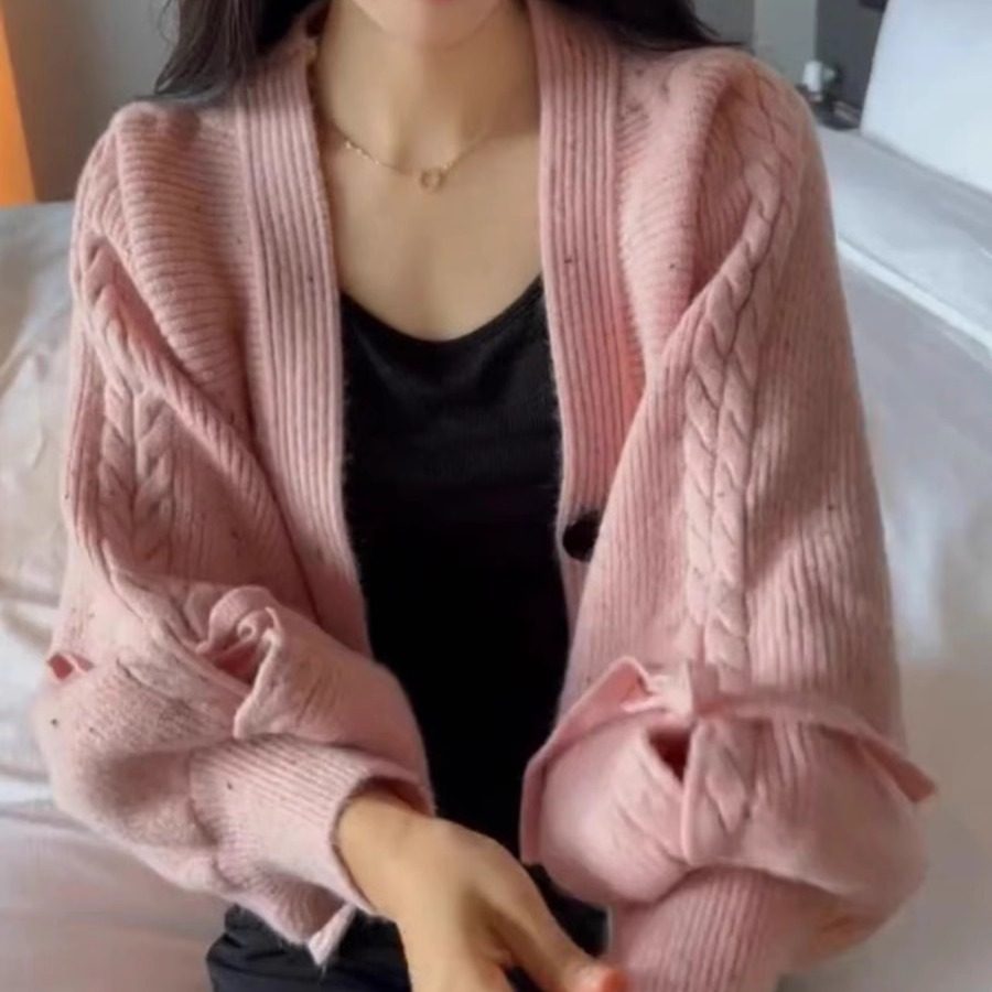 短款针织开衫女秋冬季设计感宽松V领灯笼袖系绳毛衣外套时尚上衣