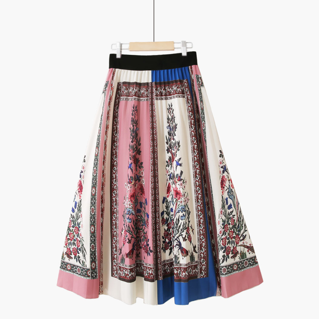 秋冬复古时尚简约梦幻印花仙女撞色条纹百褶裙中长款a字半身裙女