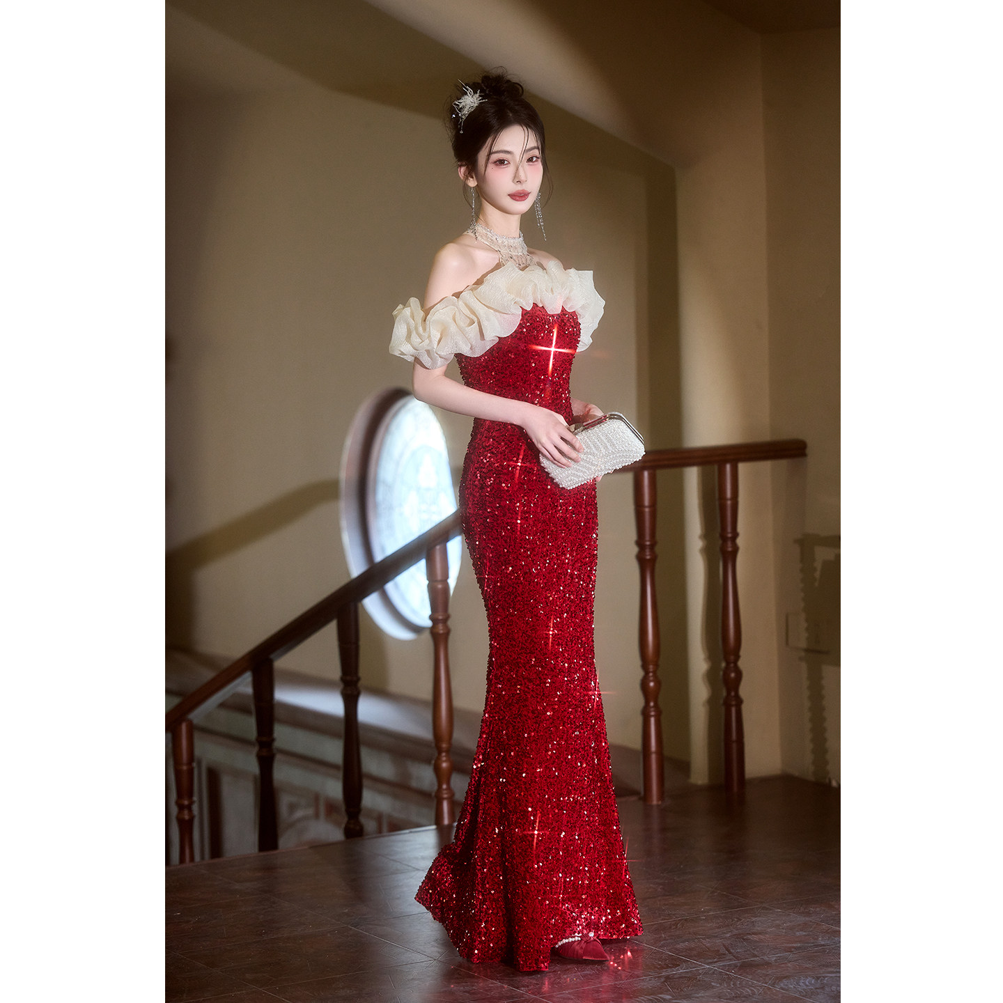 敬酒服新娘亮片高级一字肩鱼尾订婚晚礼服裙女宴会主持人气质轻奢