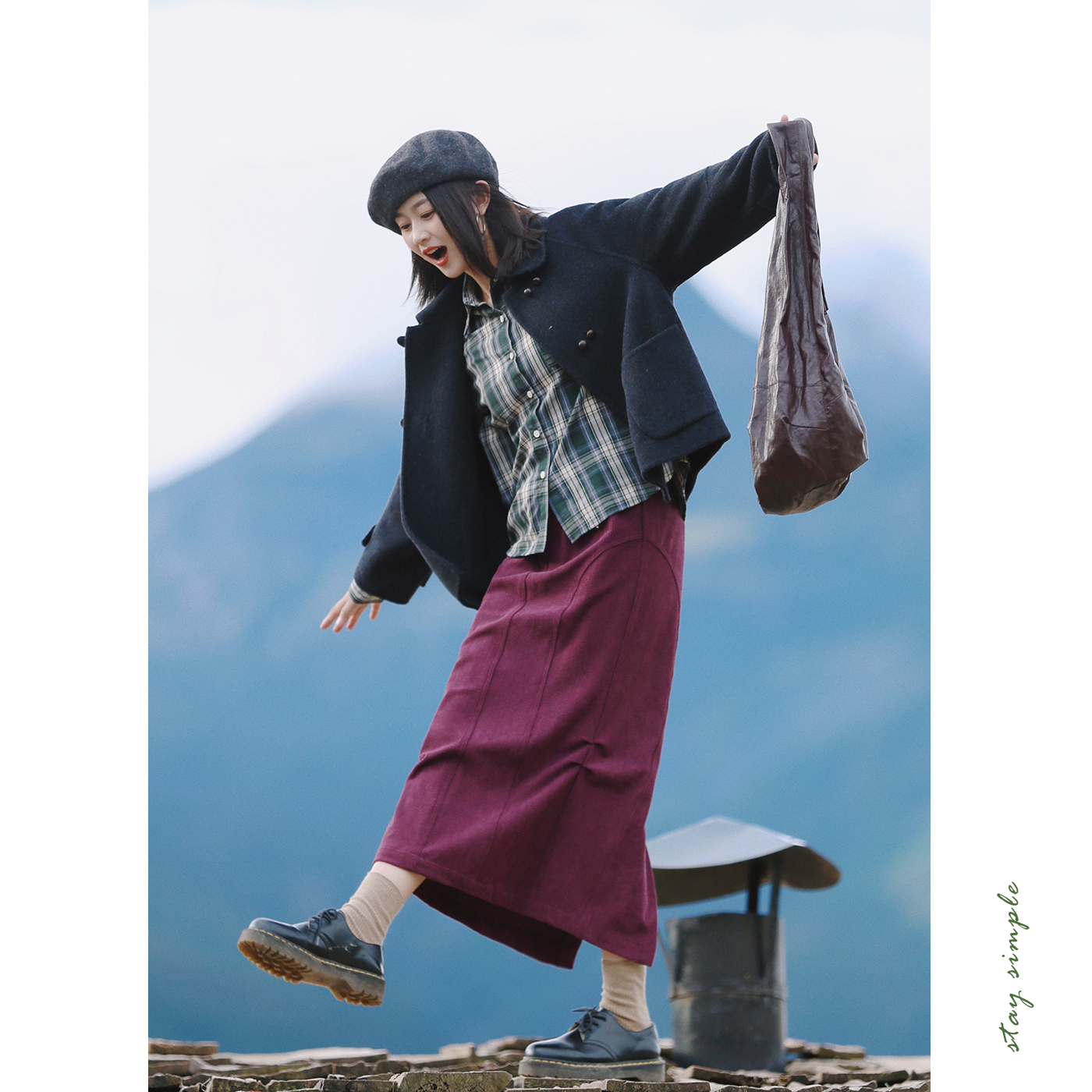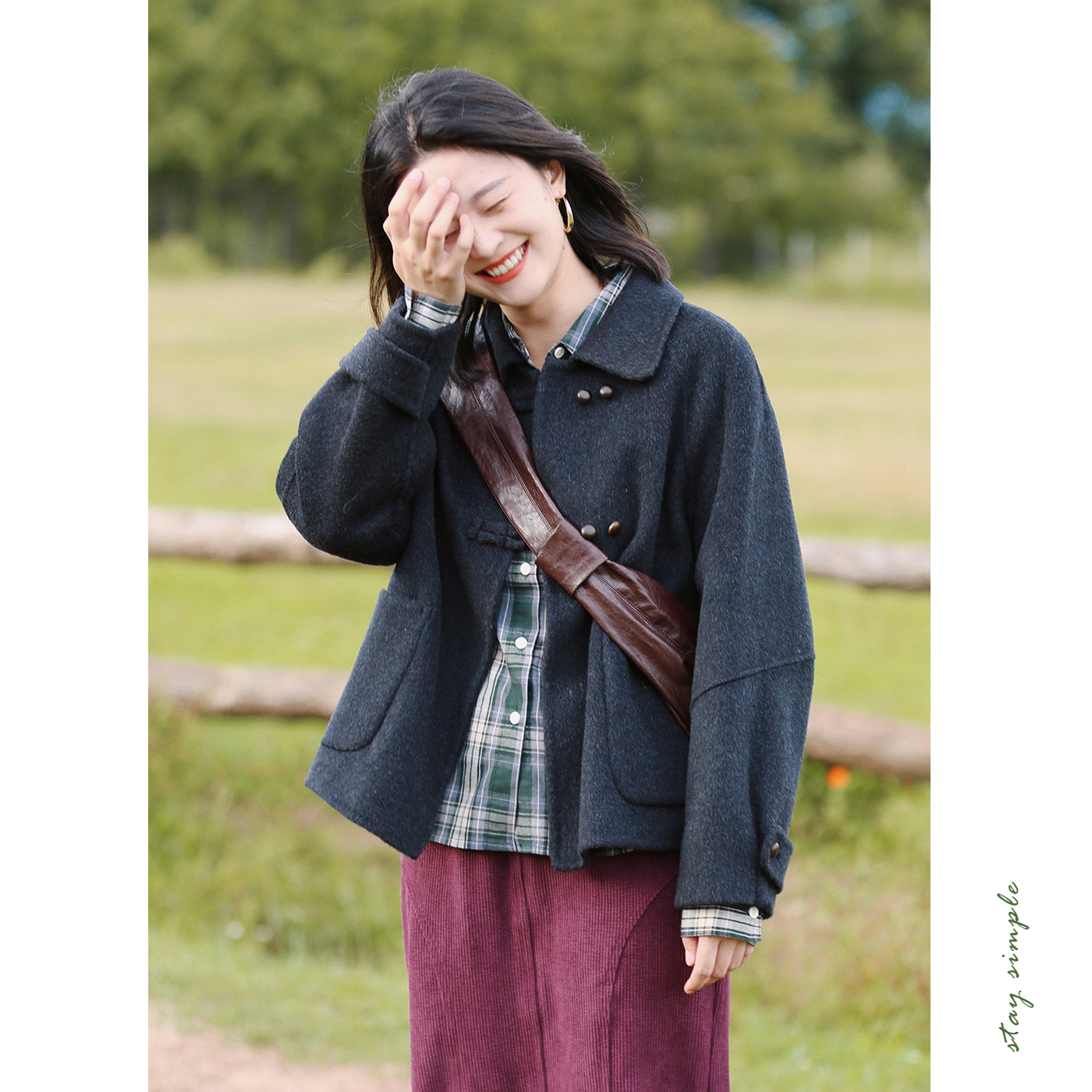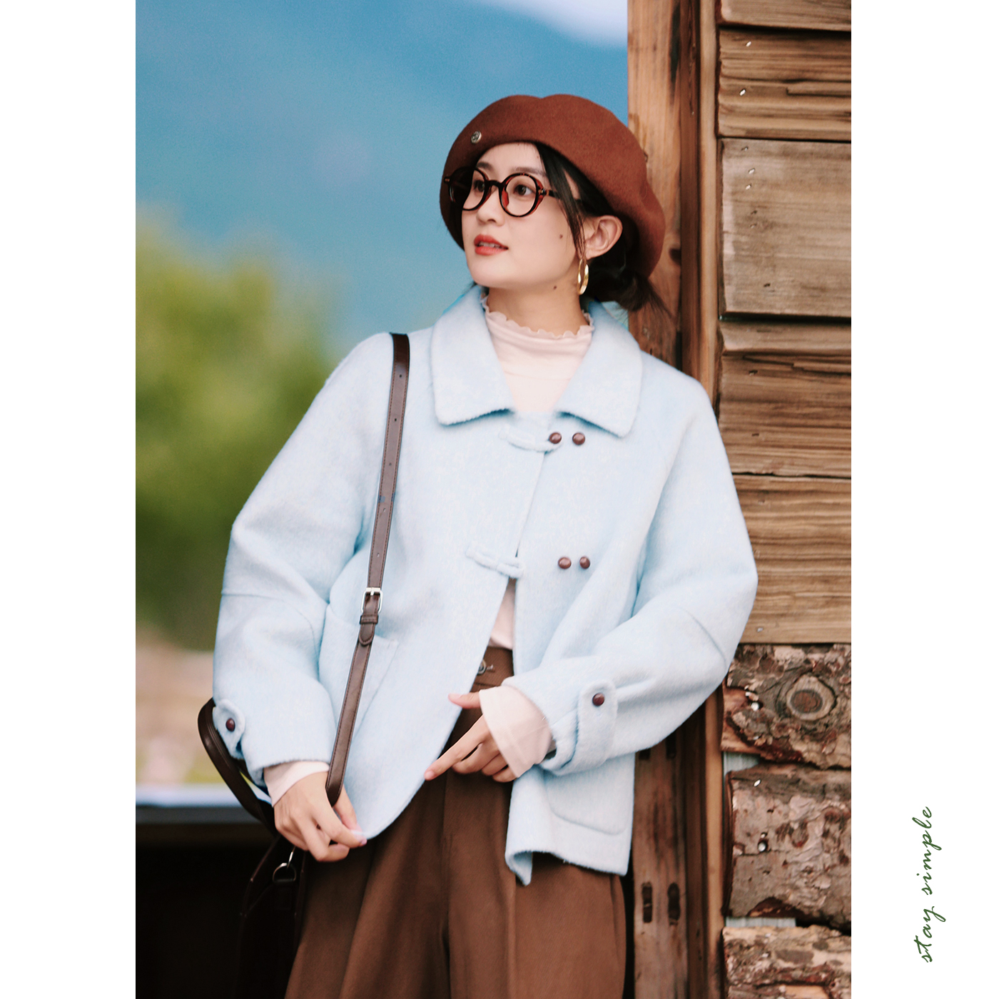 花吉C069蓝色复古文艺风蘑菇扣双面呢短款毛呢外套女2025新款秋