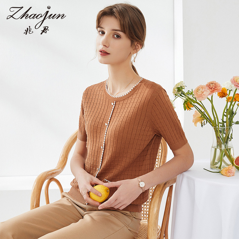 兆君春夏撞色圆领短袖T恤女 假门襟休闲桑蚕丝上衣百搭针织衫
