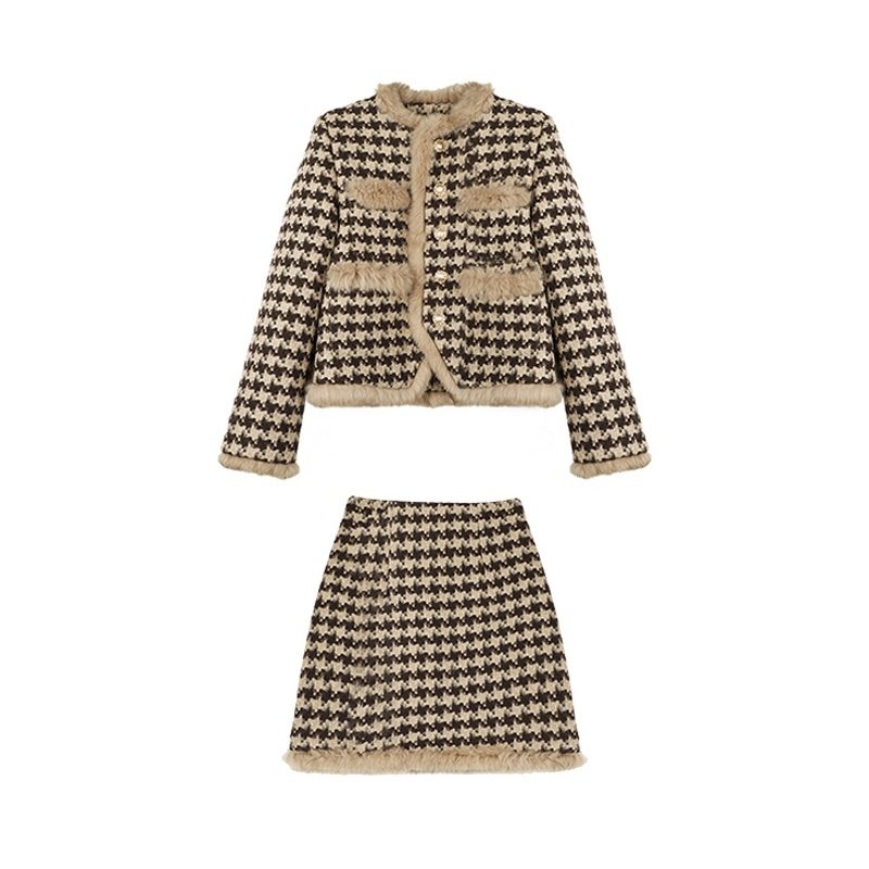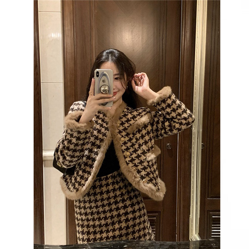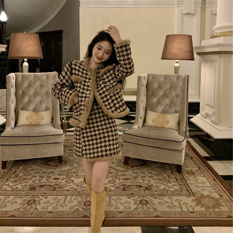 大码女装秋冬新款小香风千鸟格毛呢短外套半身裙胖mm显瘦两件套装