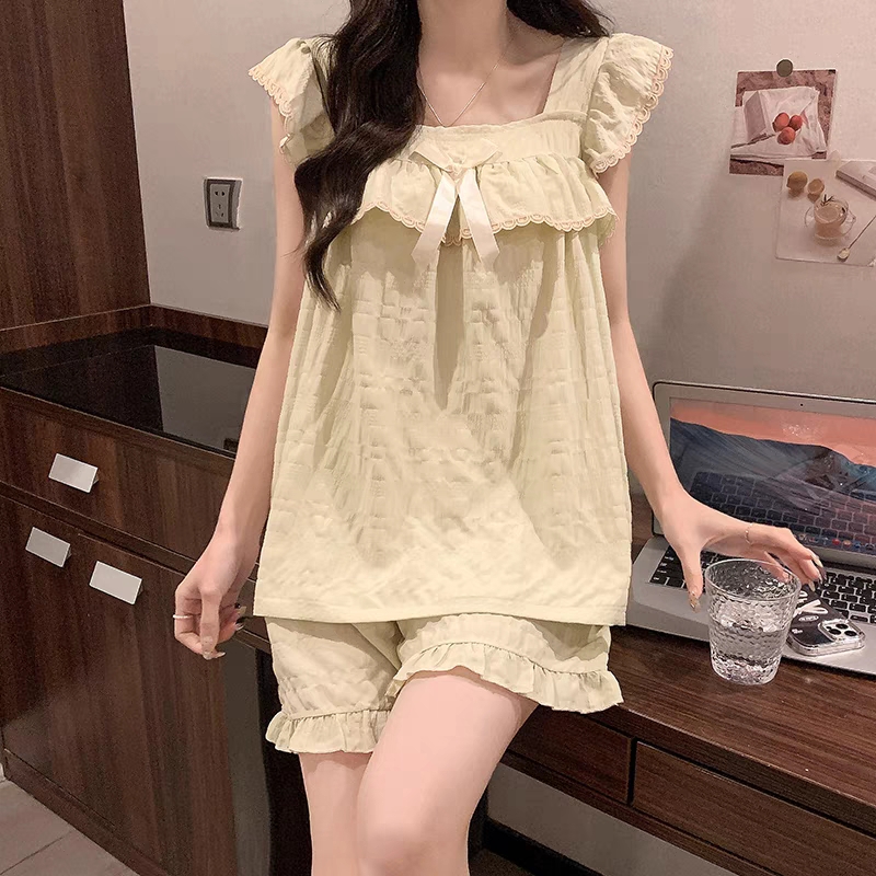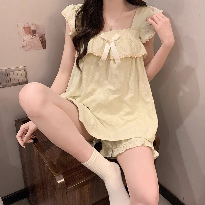 性感吊带短裤睡衣女夏季纯棉两件套装可爱绿色公主风带胸垫家居服