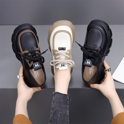 高端欧洲站真皮厚底松糕鞋女春季新款圆头单鞋英伦百搭增高小皮鞋