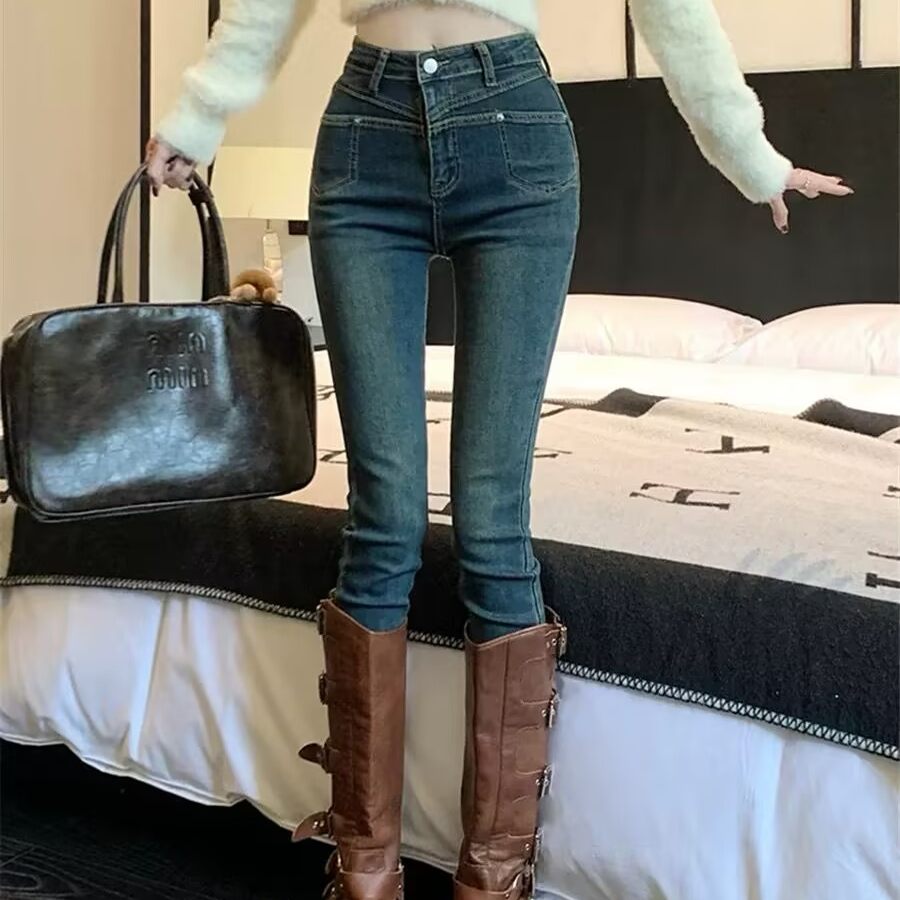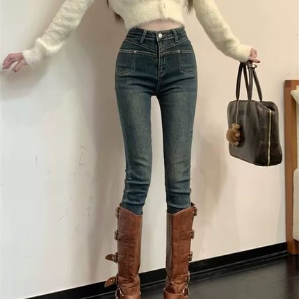 丰胯主打!复古高腰弹力小脚裤女修身显瘦性感辣妹百搭九分牛仔裤