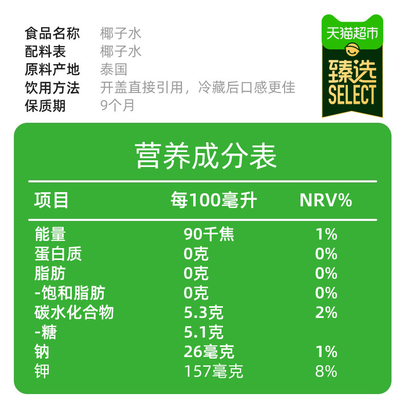 臻选耶气满满100%NFC椰子水425ml*4瓶饮料果汁电解质椰青水