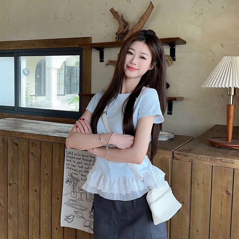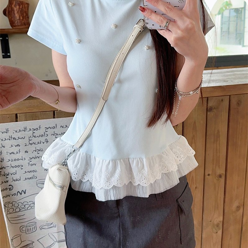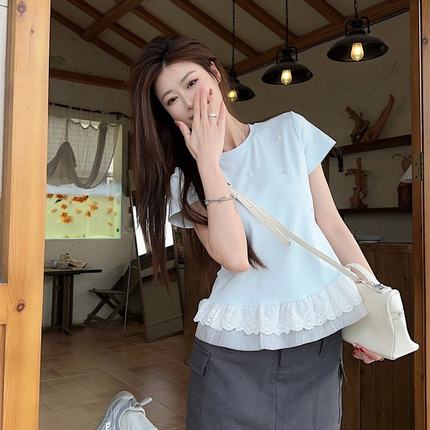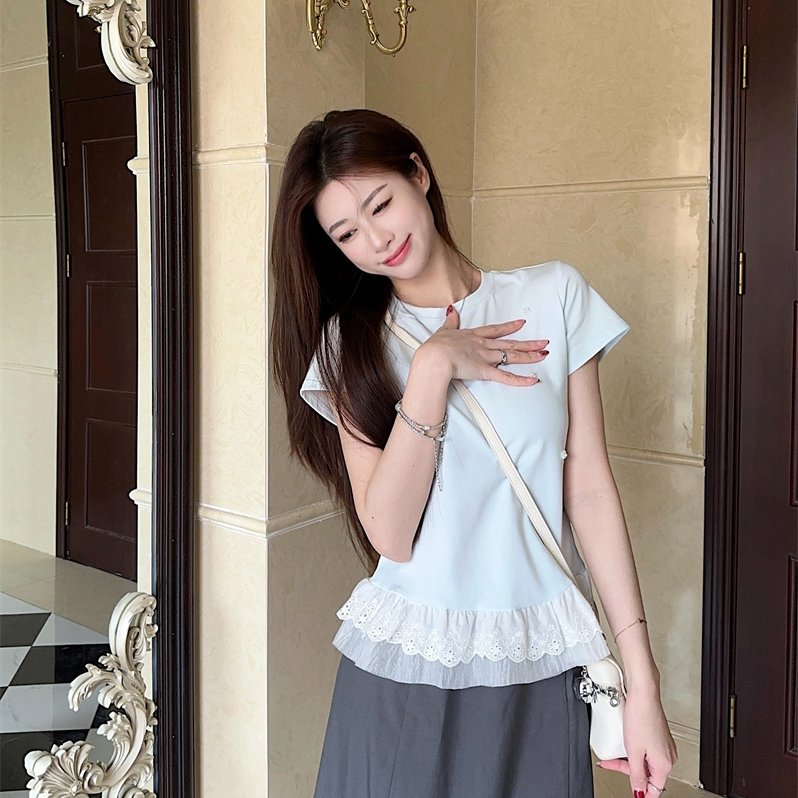 实拍 2025夏季新款钉珠装饰拼接下摆蕾丝花边短袖t恤女显瘦上衣