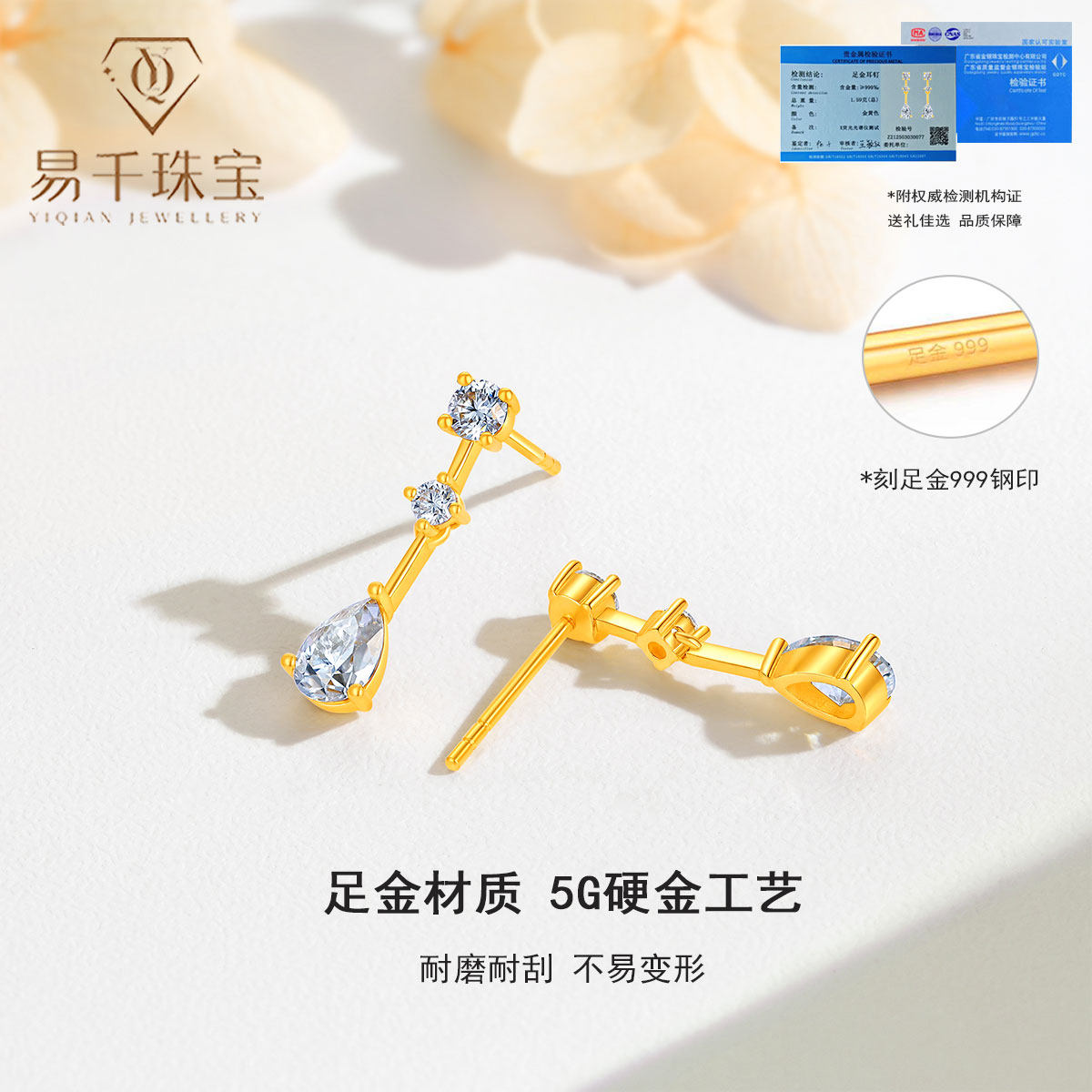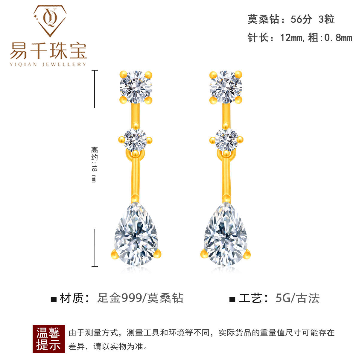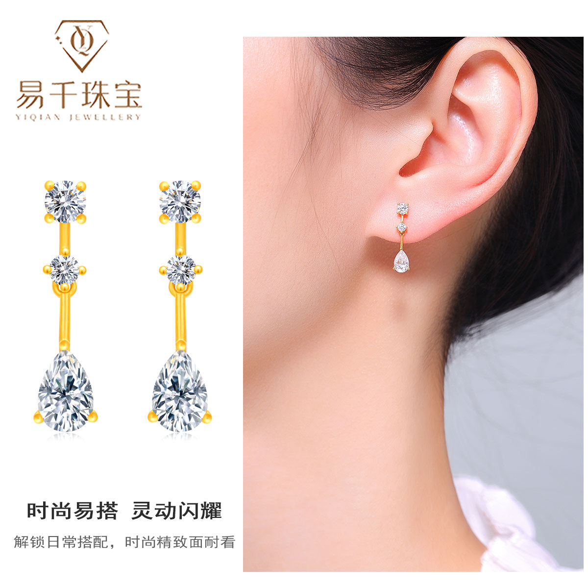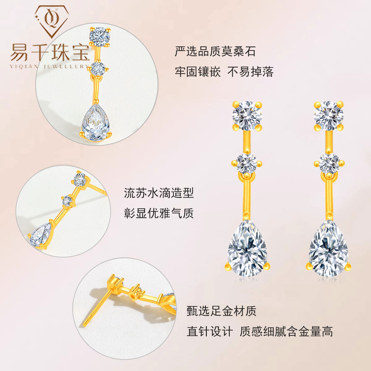 黄金耳钉999足金莫桑石流苏水滴耳环耳坠时尚古法金耳饰耳针女新