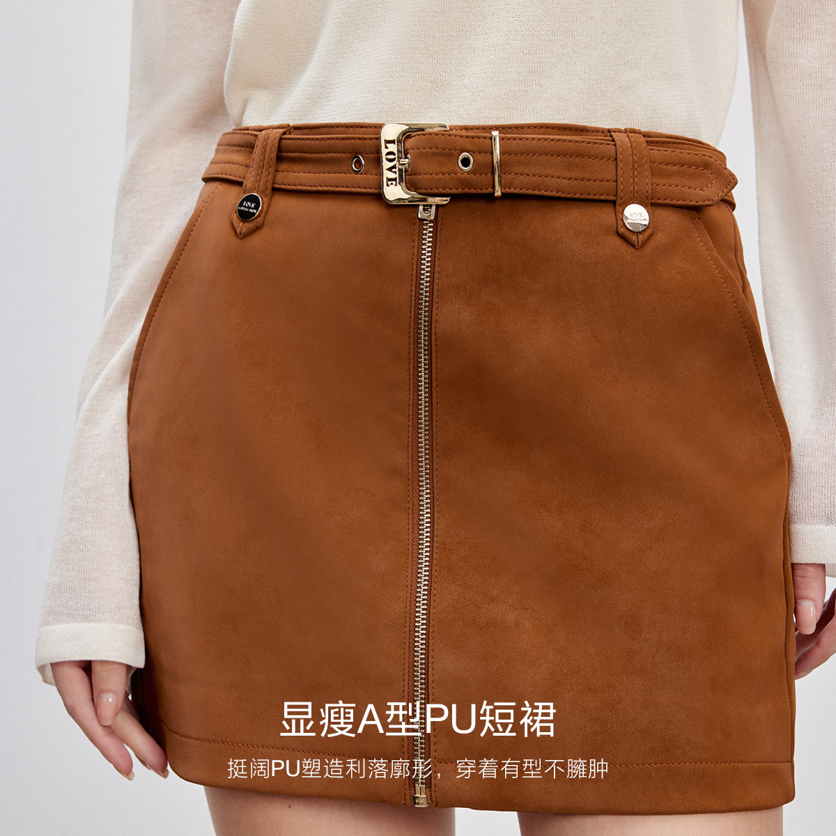 ONLY2025冬季新款超酷时尚挺括绒面料设计纯色A字PU短裙半身裙女