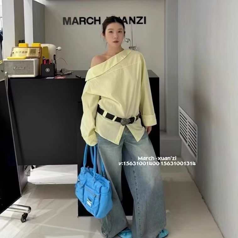 蕾丝袖口斜肩白衬衣独特百搭别致