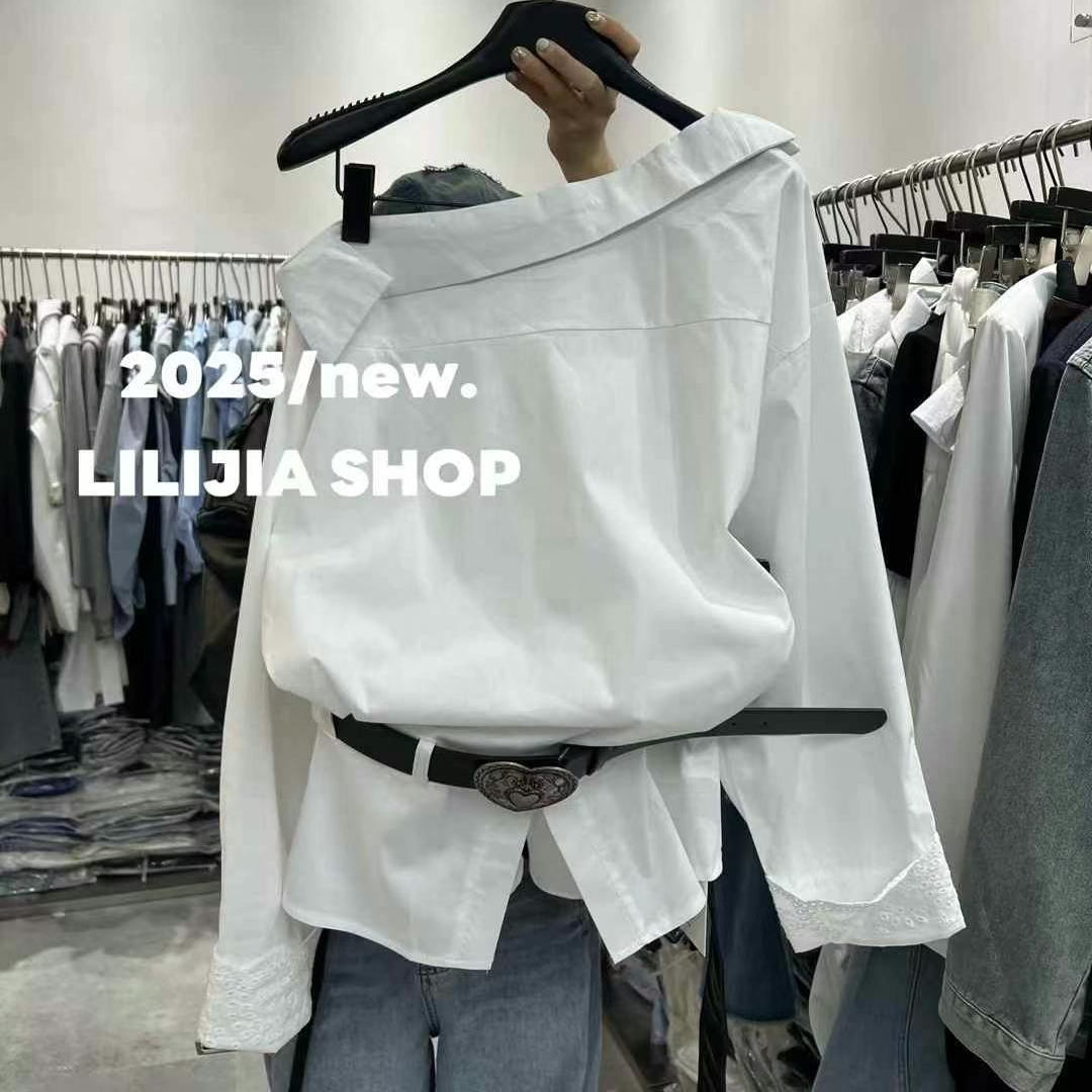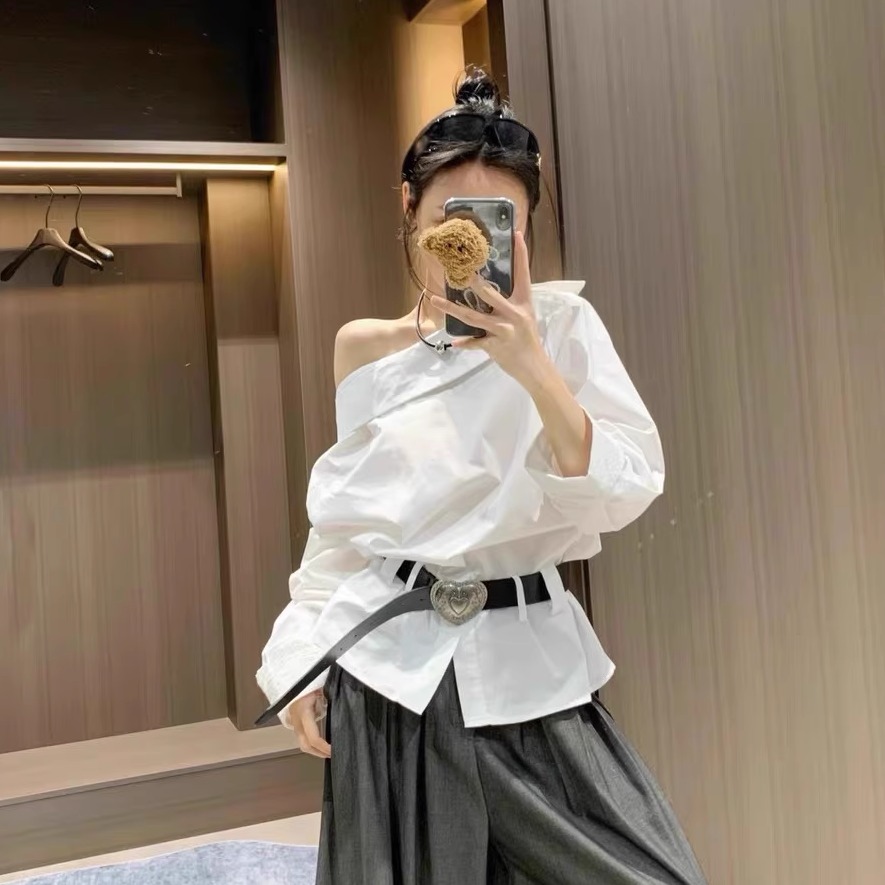 【五折】蕾丝袖口斜肩白衬衣女款爆款春夏纯欲风独特百搭别致上衣