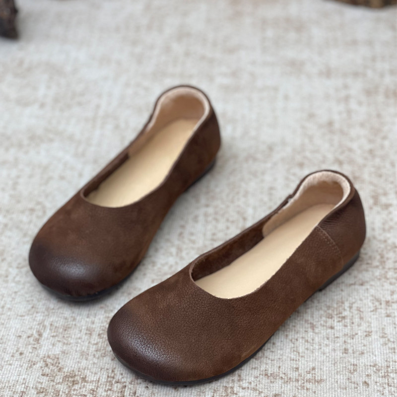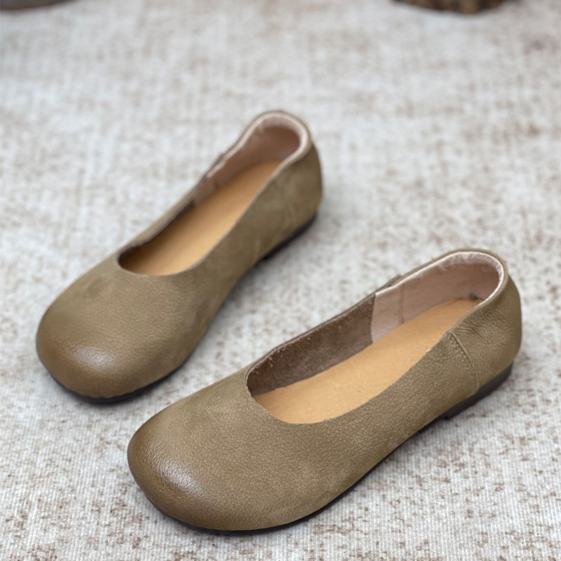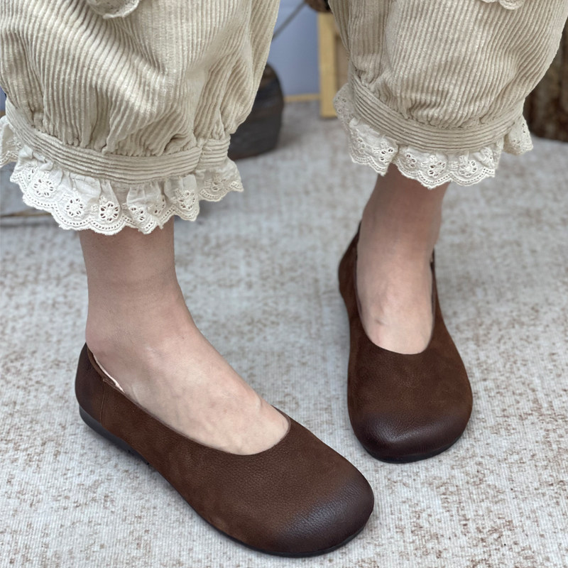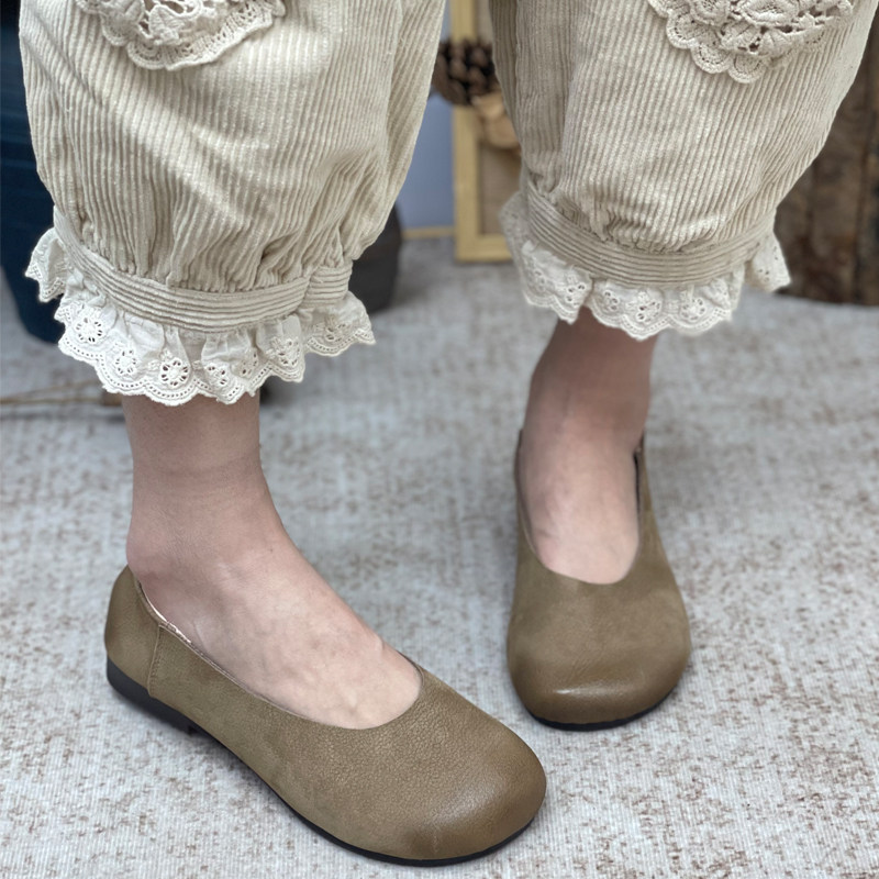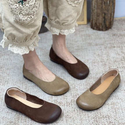 复古女鞋头层牛皮圆头中年妈妈鞋新款牛筋底老人鞋一脚蹬防滑平底