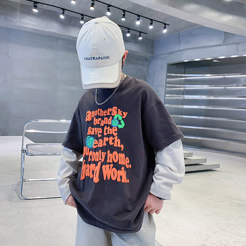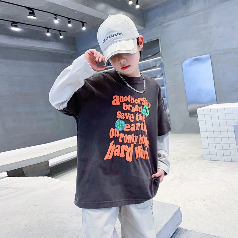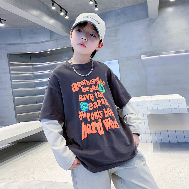 男童秋季酷帅假两件长袖t恤2025新款儿童男孩春秋宽松薄款上衣潮