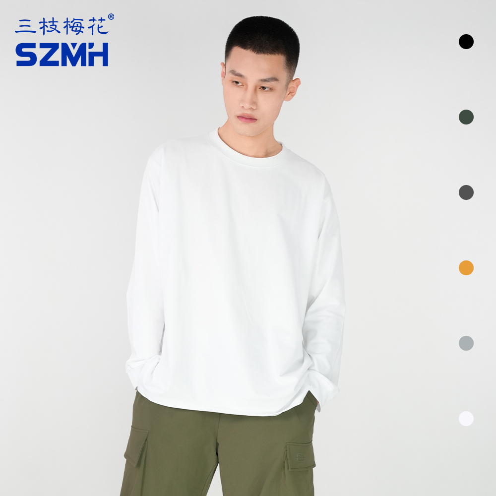 三枝梅花牌长袖t恤男纯棉240G圆领长T女休闲宽松情侣款打底衫春秋