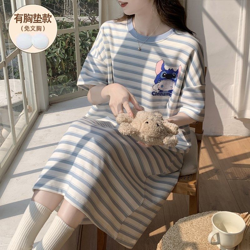 纯棉睡裙夏季女h款2024新款带胸垫短袖待产裙草莓熊卡通孕妇睡衣
