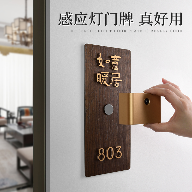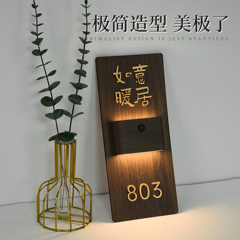 高级创意木饰风充电智能感应灯发光门牌入户门灯牌家用立体亚克力led号码牌定制住宅公寓房号牌平安喜乐新款