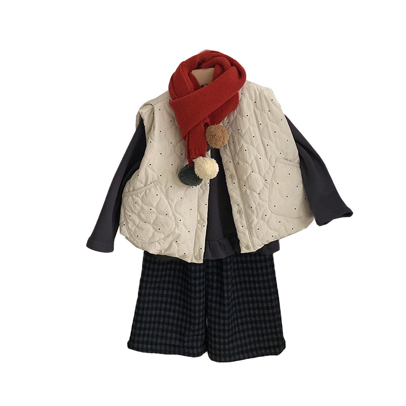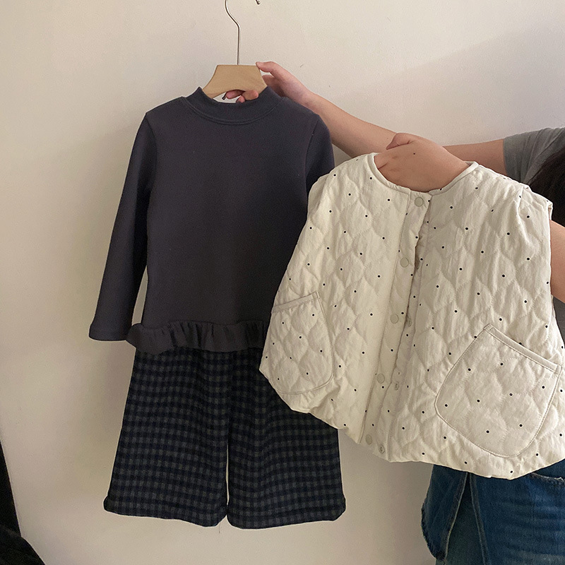 韩版女童冬季加绒花边打底衫波点夹棉马甲2025加绒格子裤三件套