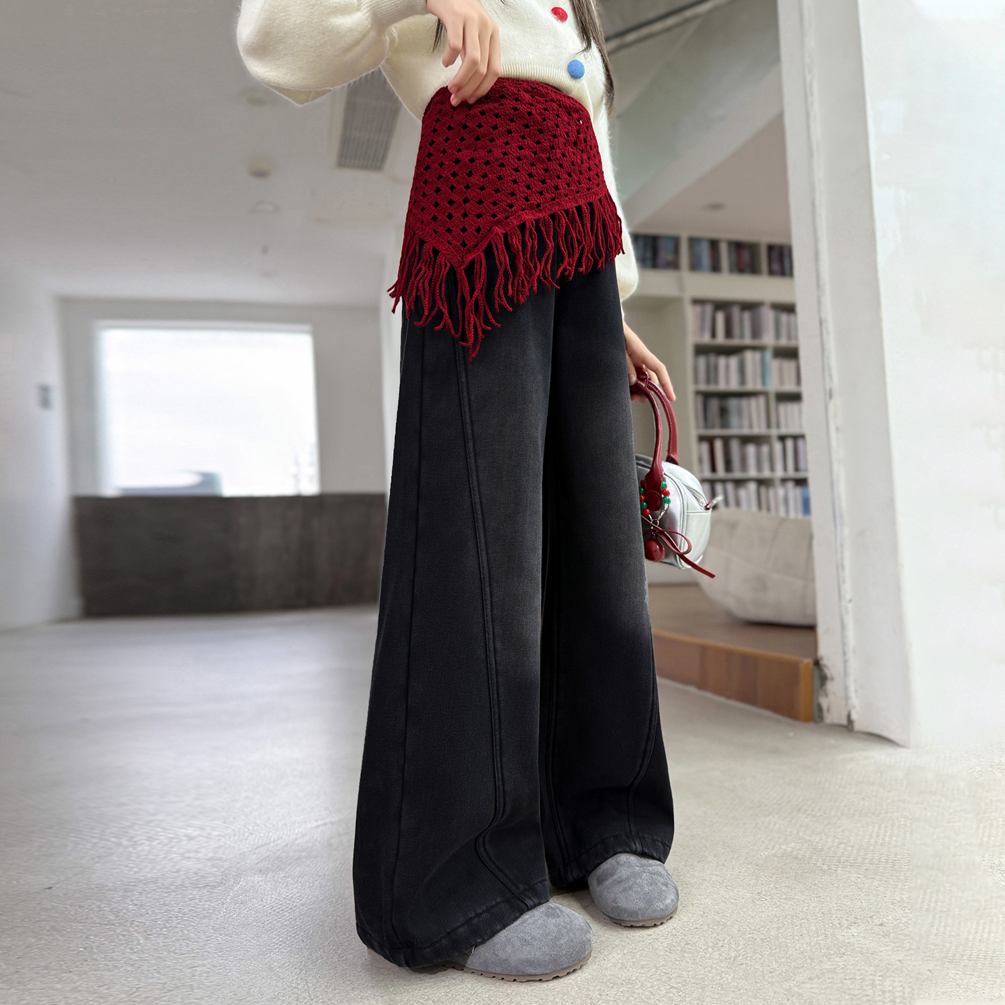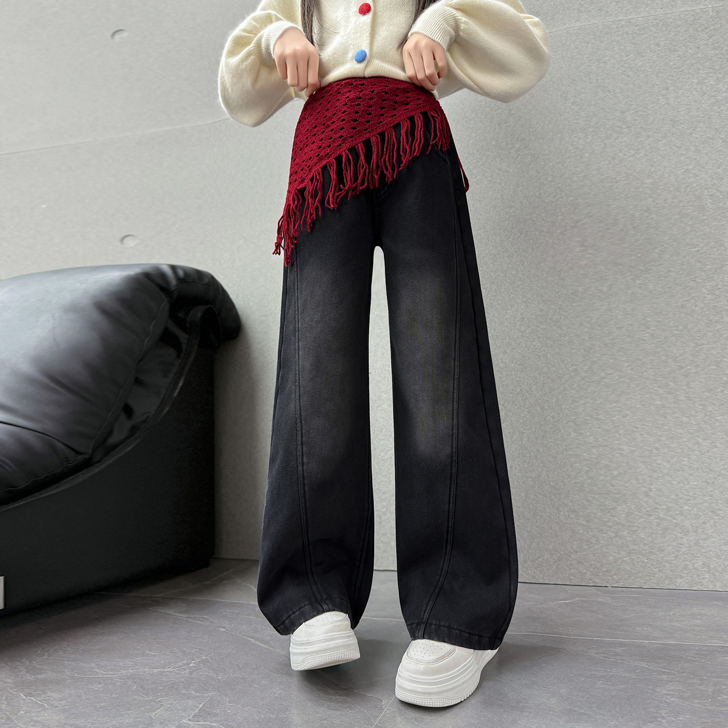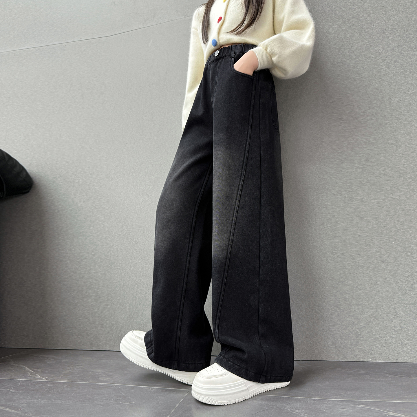女童加绒裤子秋冬2025新款秋装女孩冬季加厚拼接阔腿裤儿童牛仔裤