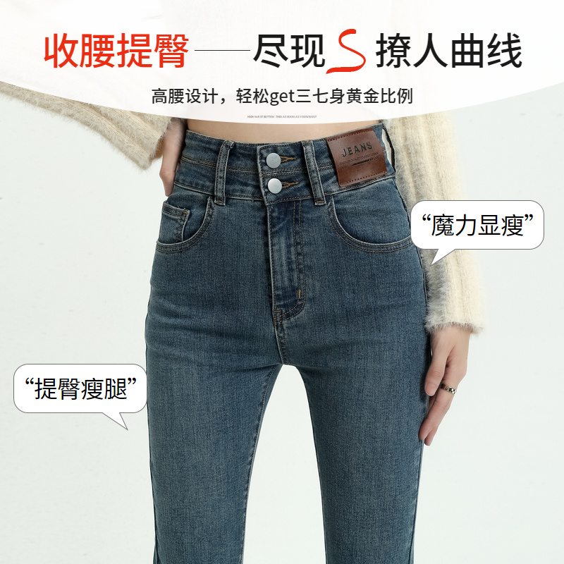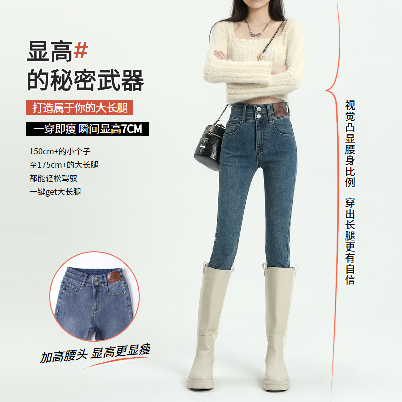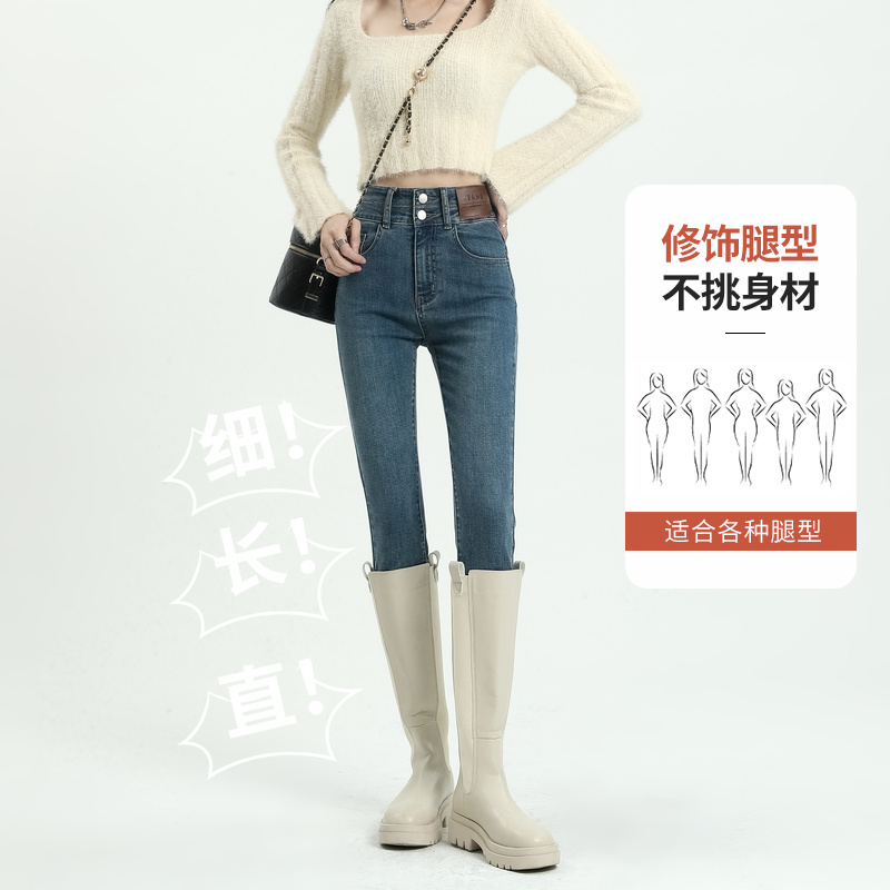 复古蓝牛仔裤女秋冬加绒新款高腰显瘦小脚紧身铅笔配长靴子的裤子