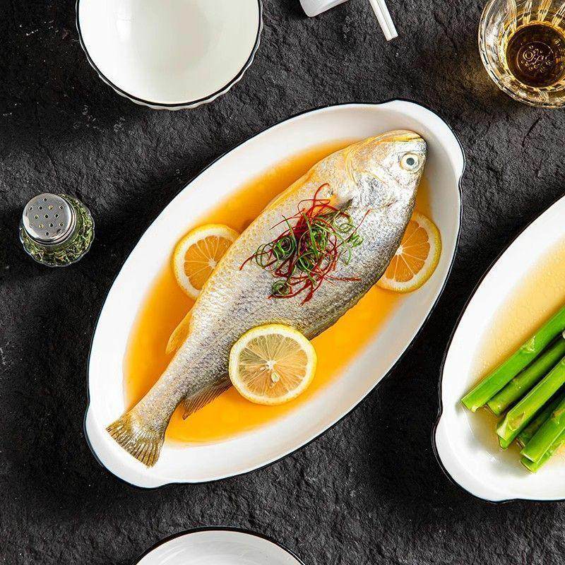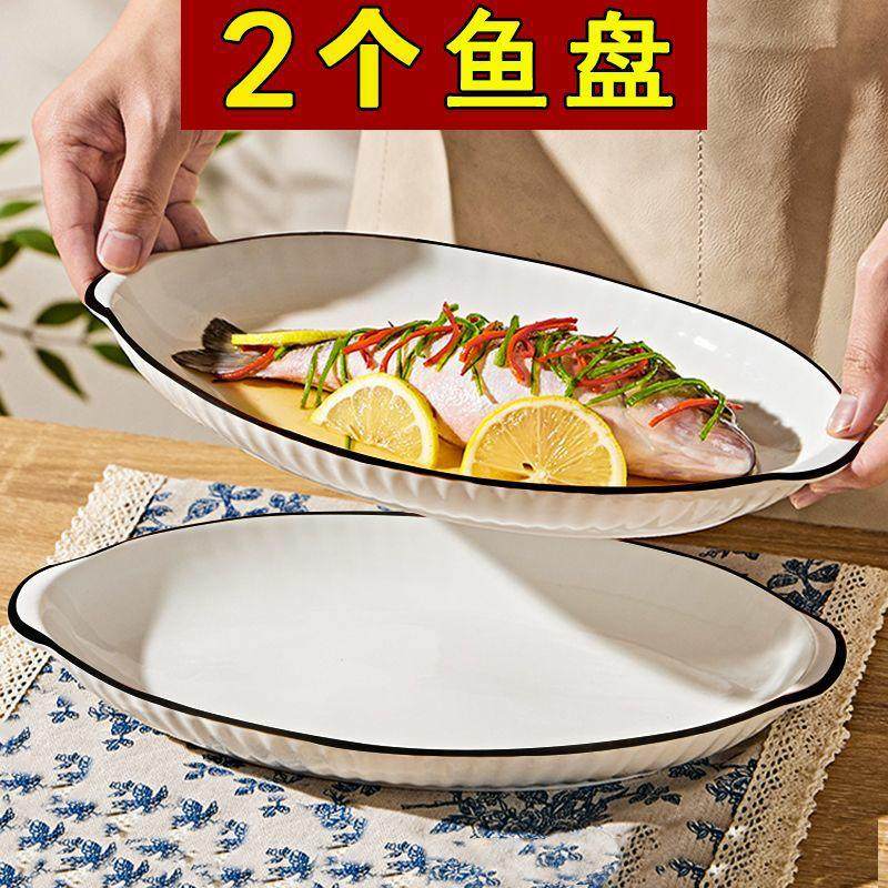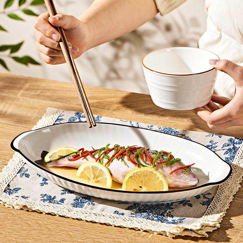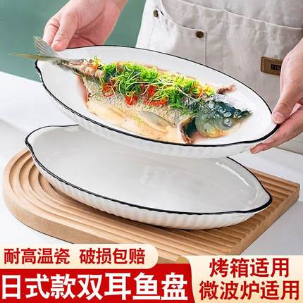双耳鱼盘 陶瓷大号家用带柄盘子创意北欧蒸鱼盘烤鱼盘子盘子餐具