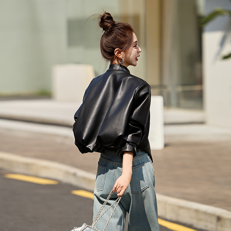 黑色皮衣女款2025新款立领小个子宽松机车服不对称短款皮夹克外套