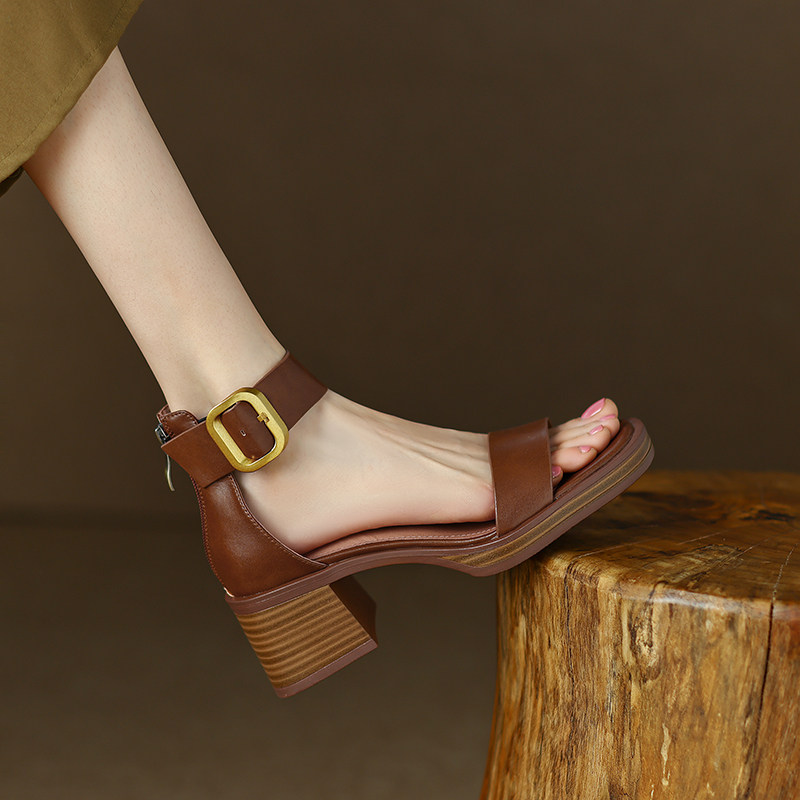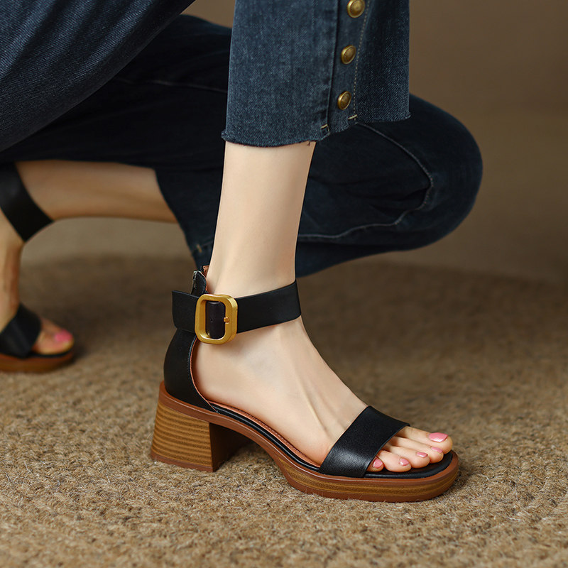真皮高跟防水台粗跟凉鞋夏季女士脚环扣复古风一字带露趾凉鞋厚底