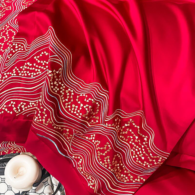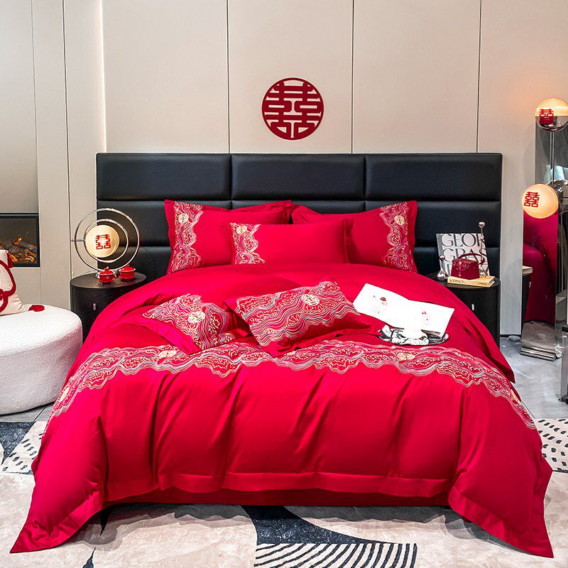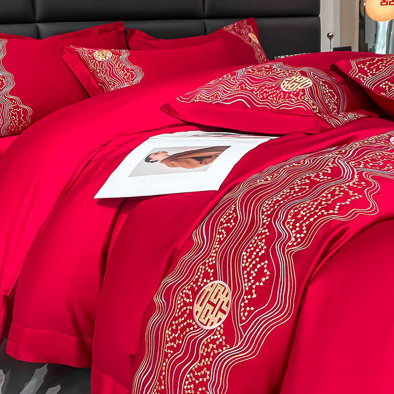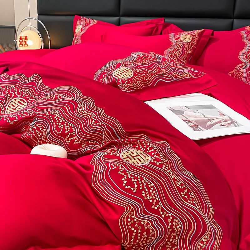 轻奢婚庆四件套红色喜庆结婚床单被套纯棉长绒棉新婚刺Z绣床上用