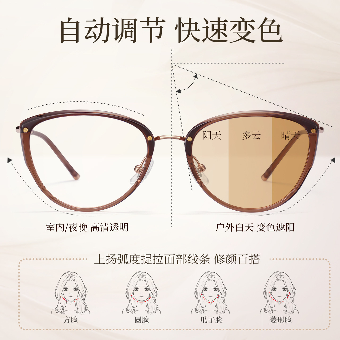 自动感光变色近视眼镜女可配度数高级感茶色素颜一镜三用猫眼眼镜