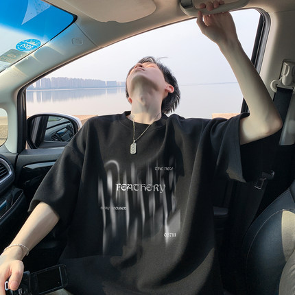 黑色重磅短袖t恤男秋季美式潮牌印花五分袖纯棉宽松休闲半袖上衣