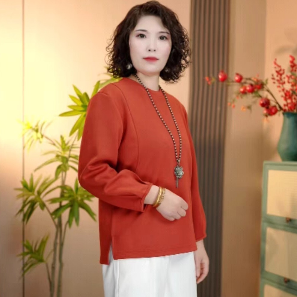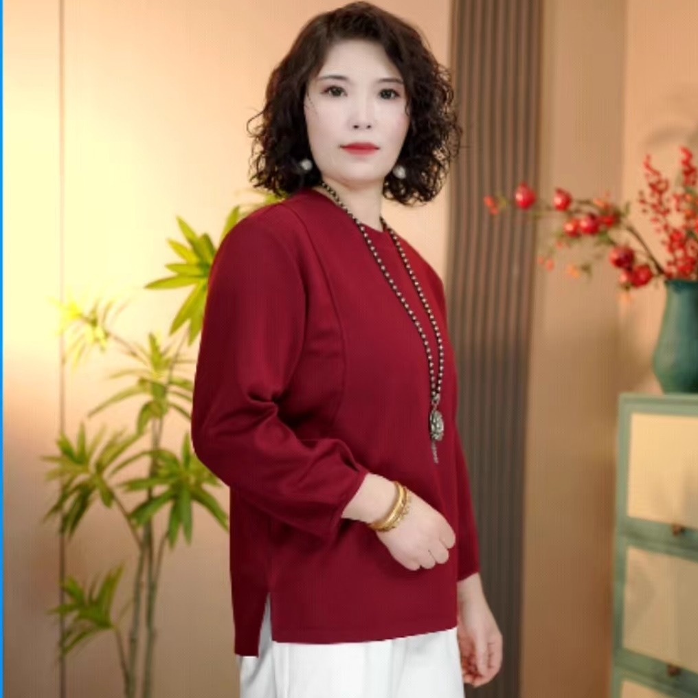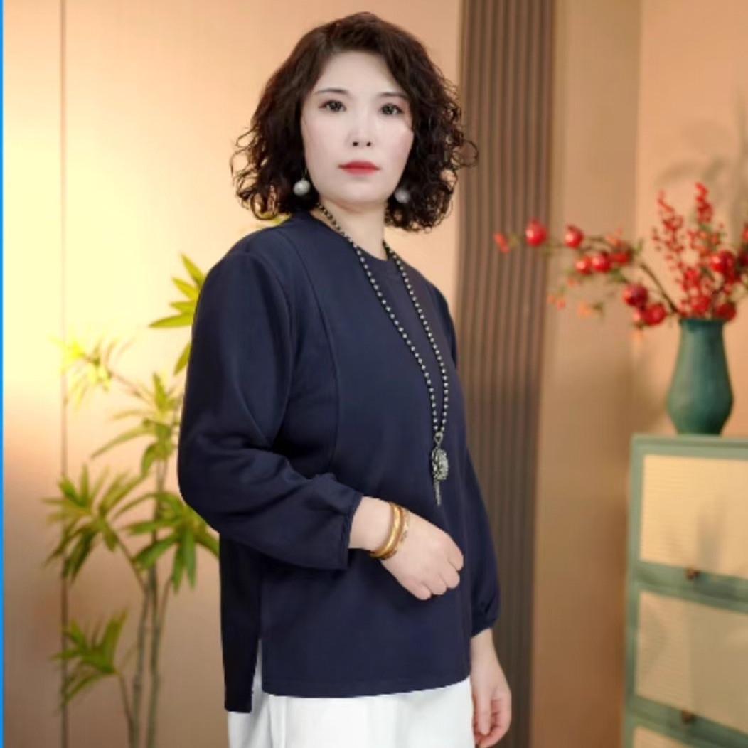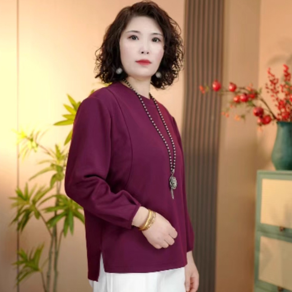 休闲百搭圆领套头小衫秋季新款纯色宽松七分袖显瘦中老年女装上衣