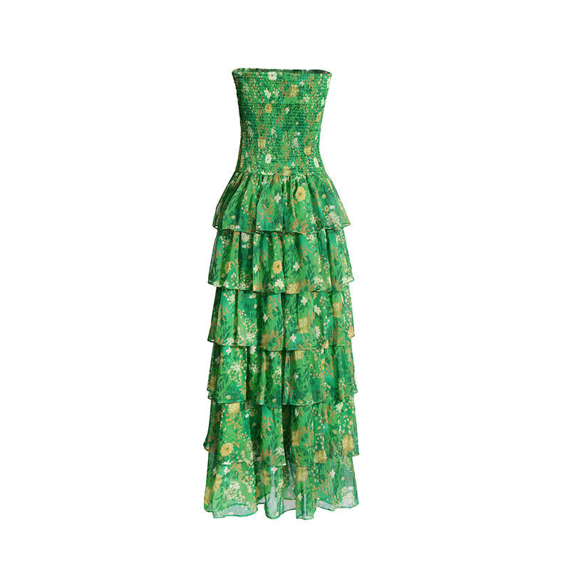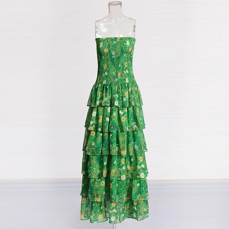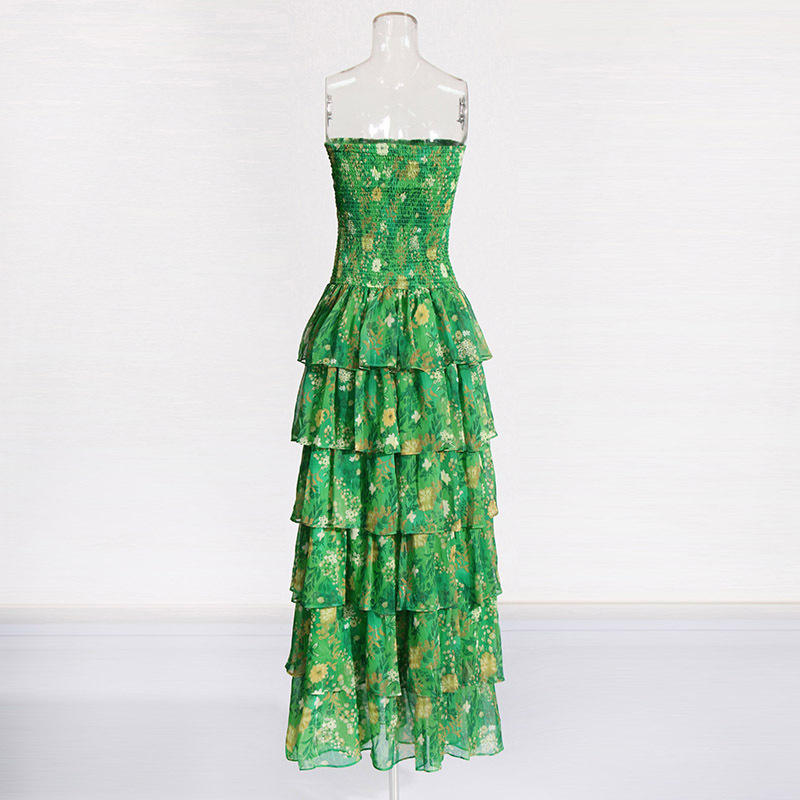 甜美田园风雪纺裙夏季绿色印花抹胸荷叶边叠层连衣裙女单件涤纶