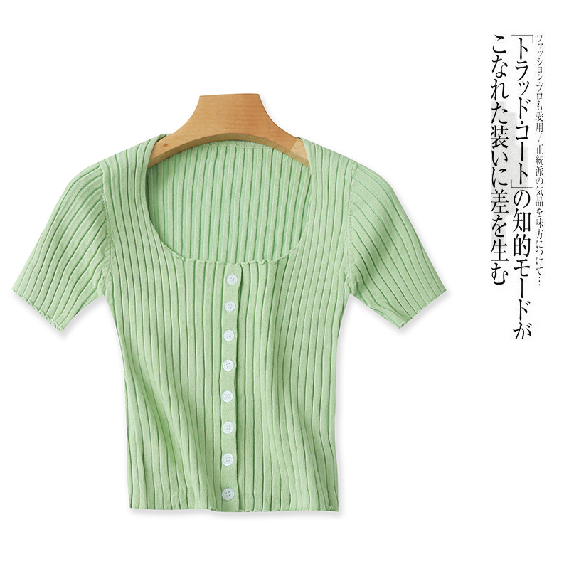 短款针织开衫T恤 春夏新款女装时尚修身方领单排扣短袖坑条27978