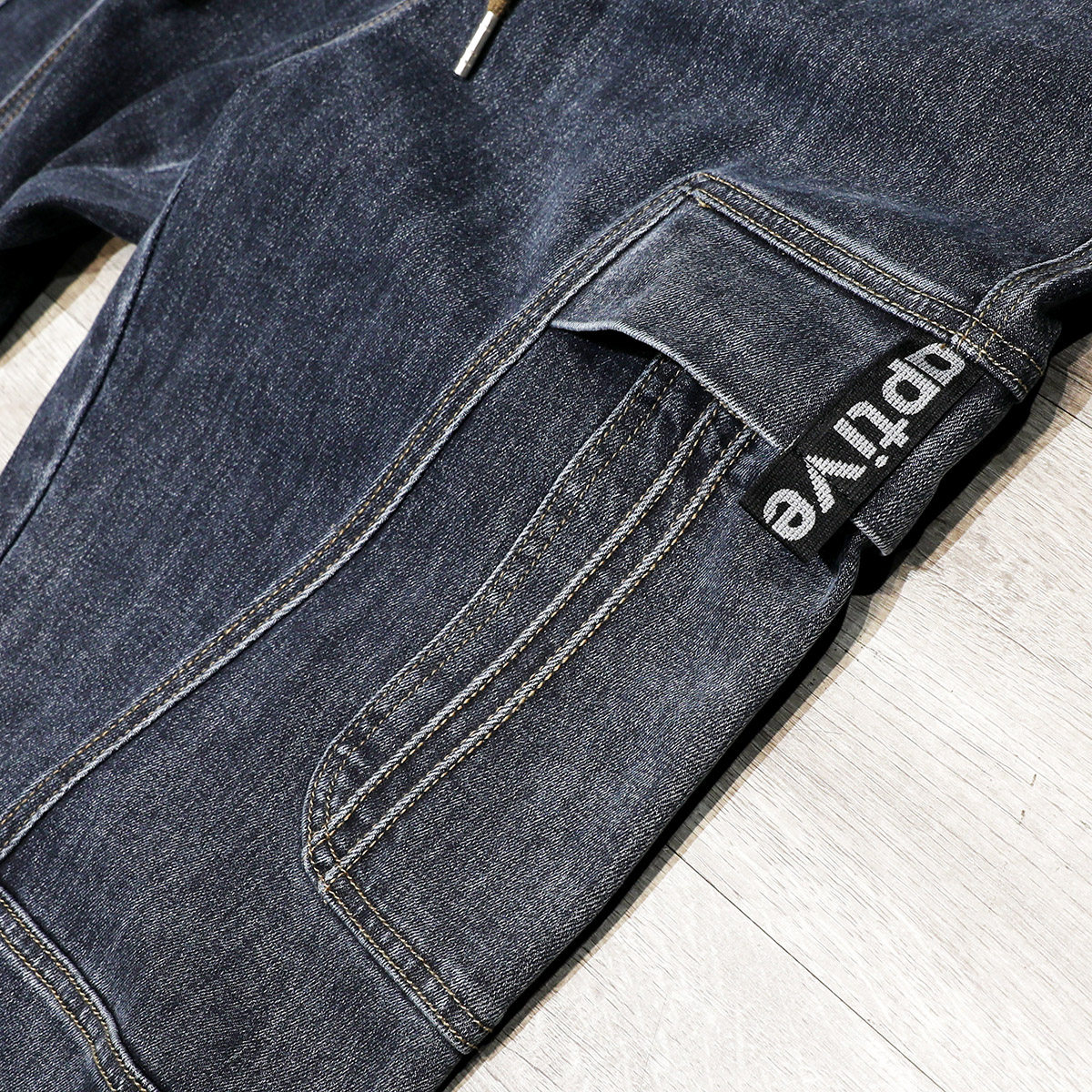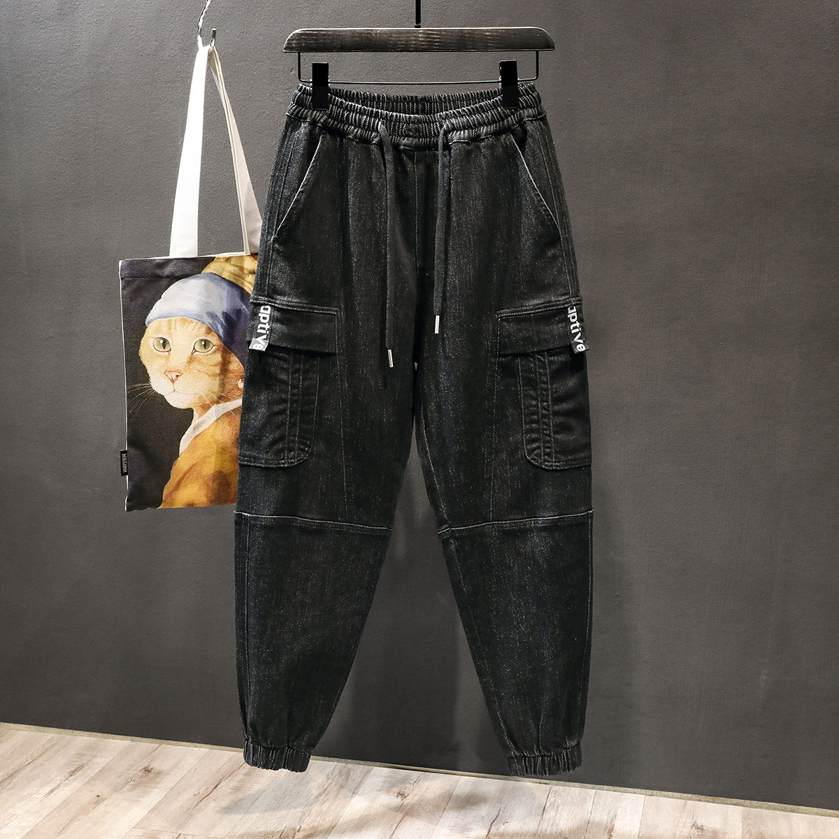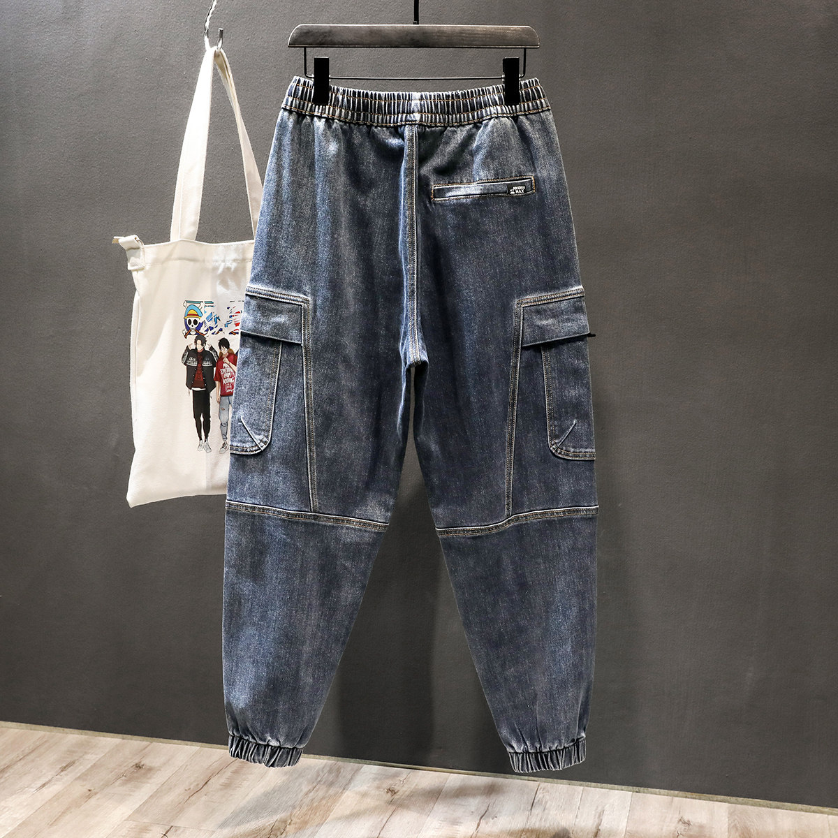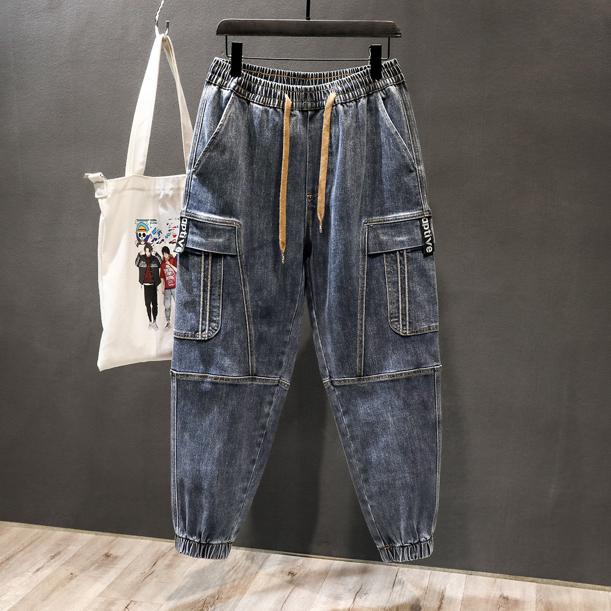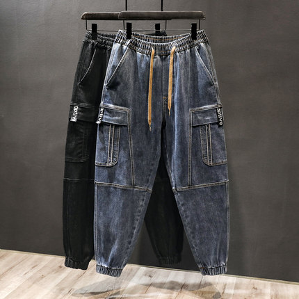 ins潮牌系绳束脚九分工装牛仔裤