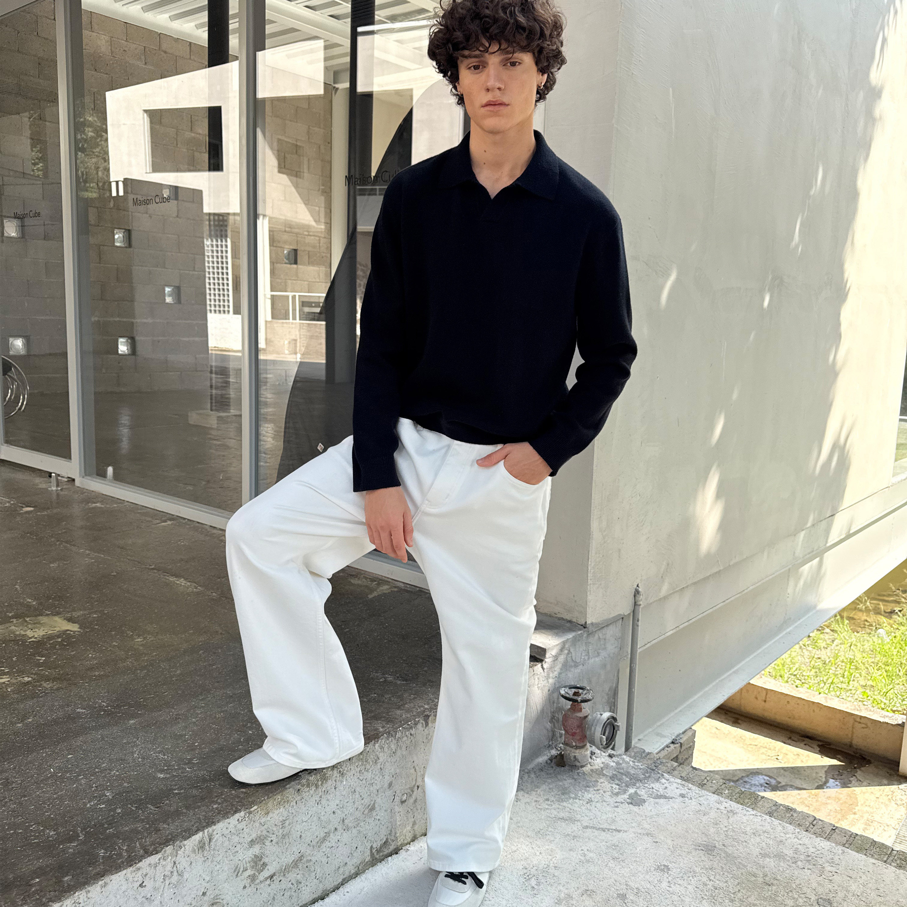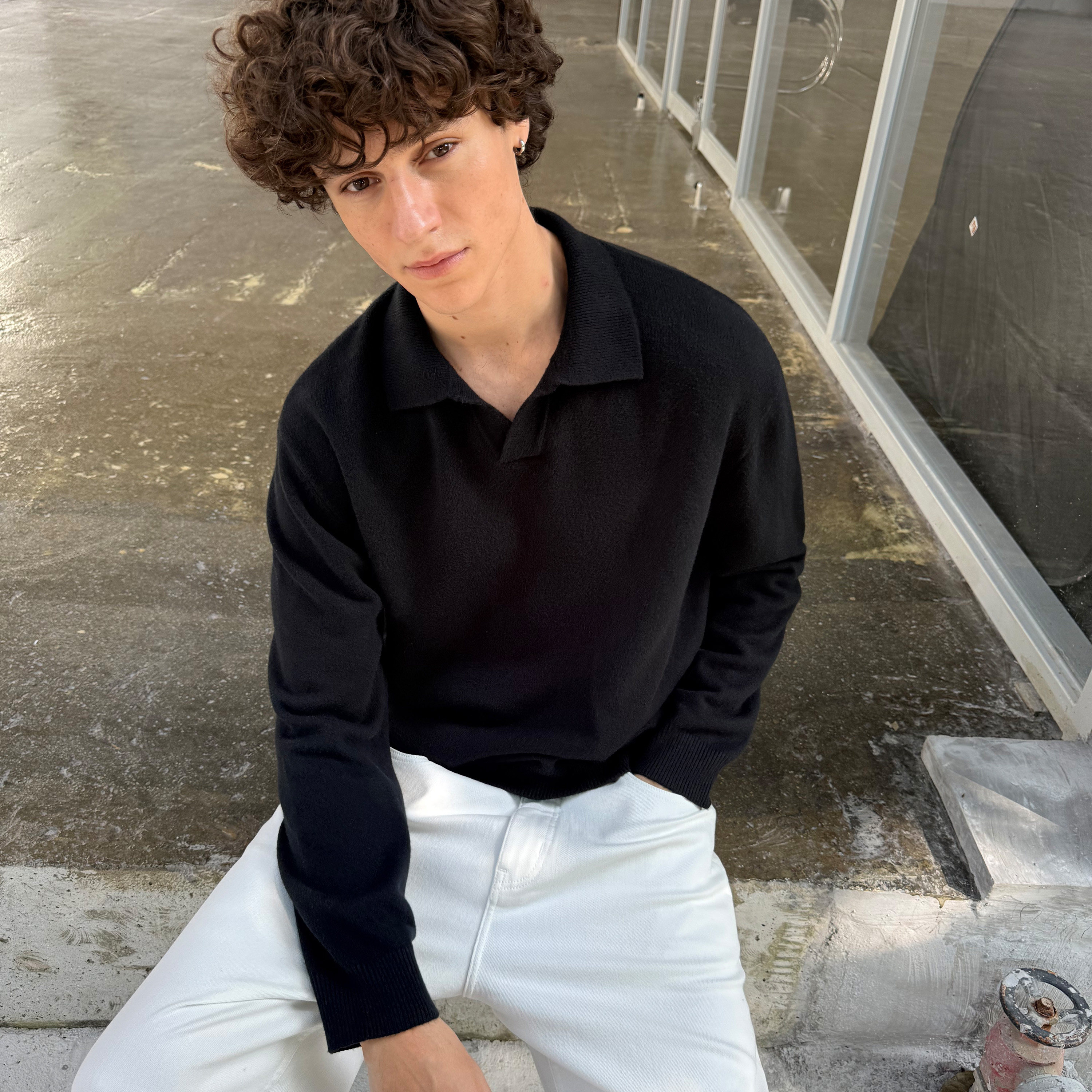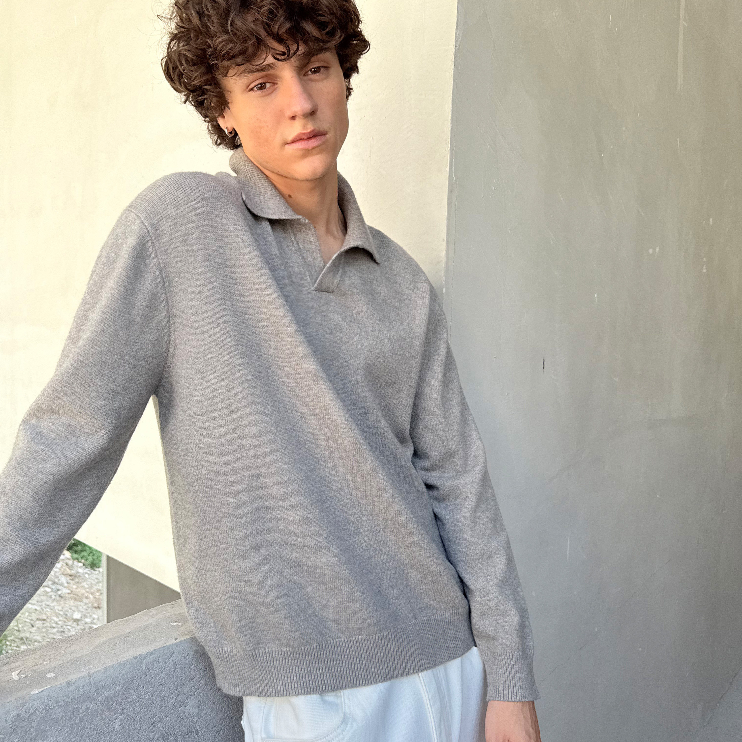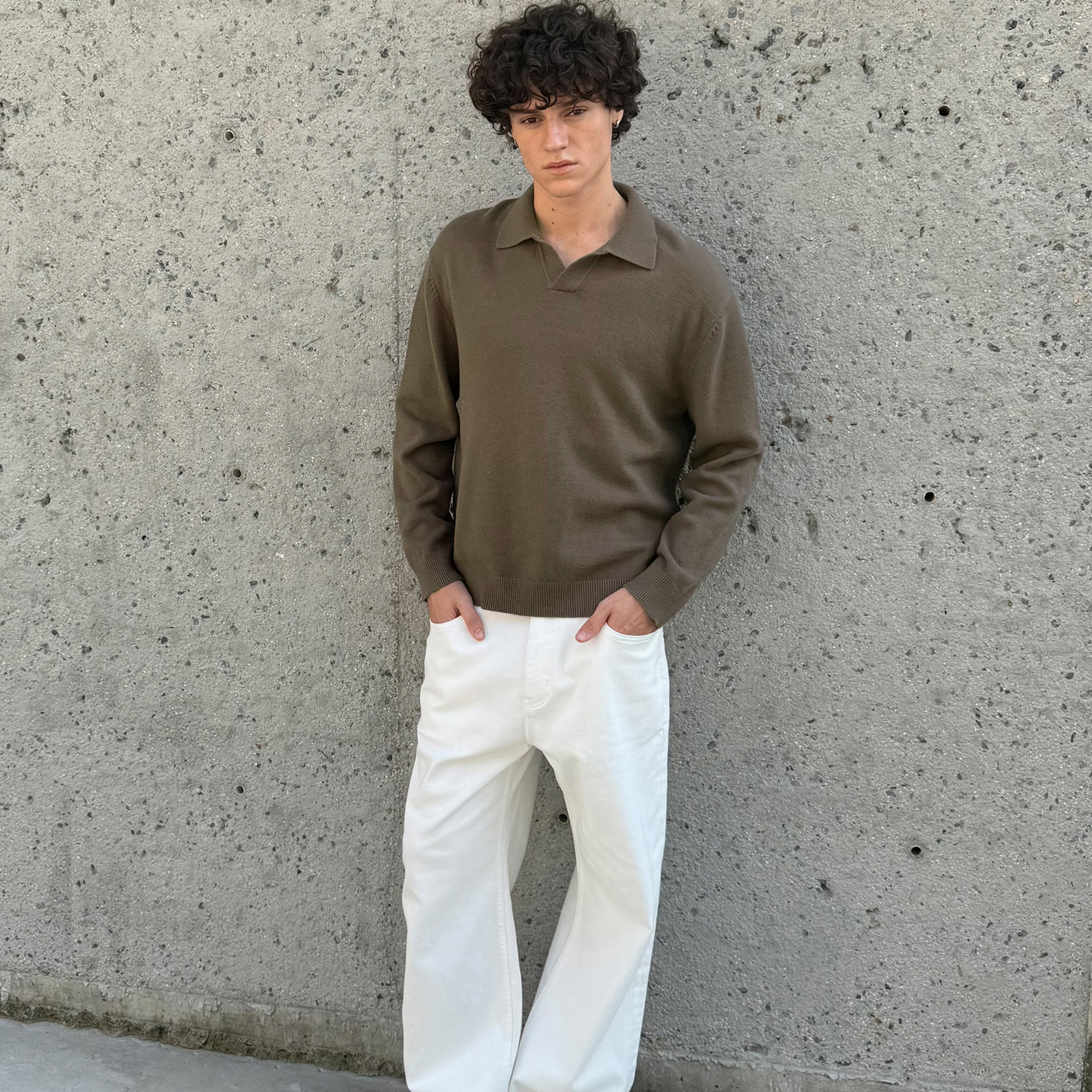羊毛混纺复古polo领毛织长袖